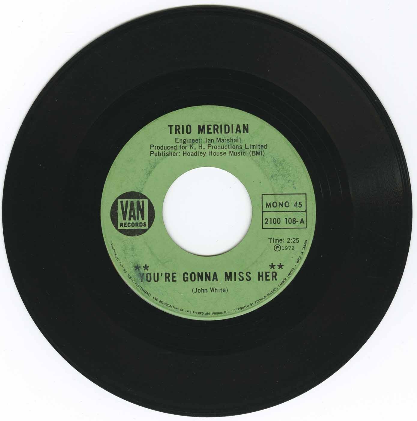 | Trio Meridian | You're Gonna Miss Her | You're Gonna Miss Her b/w Warm Red Wine | 02:29 | |
