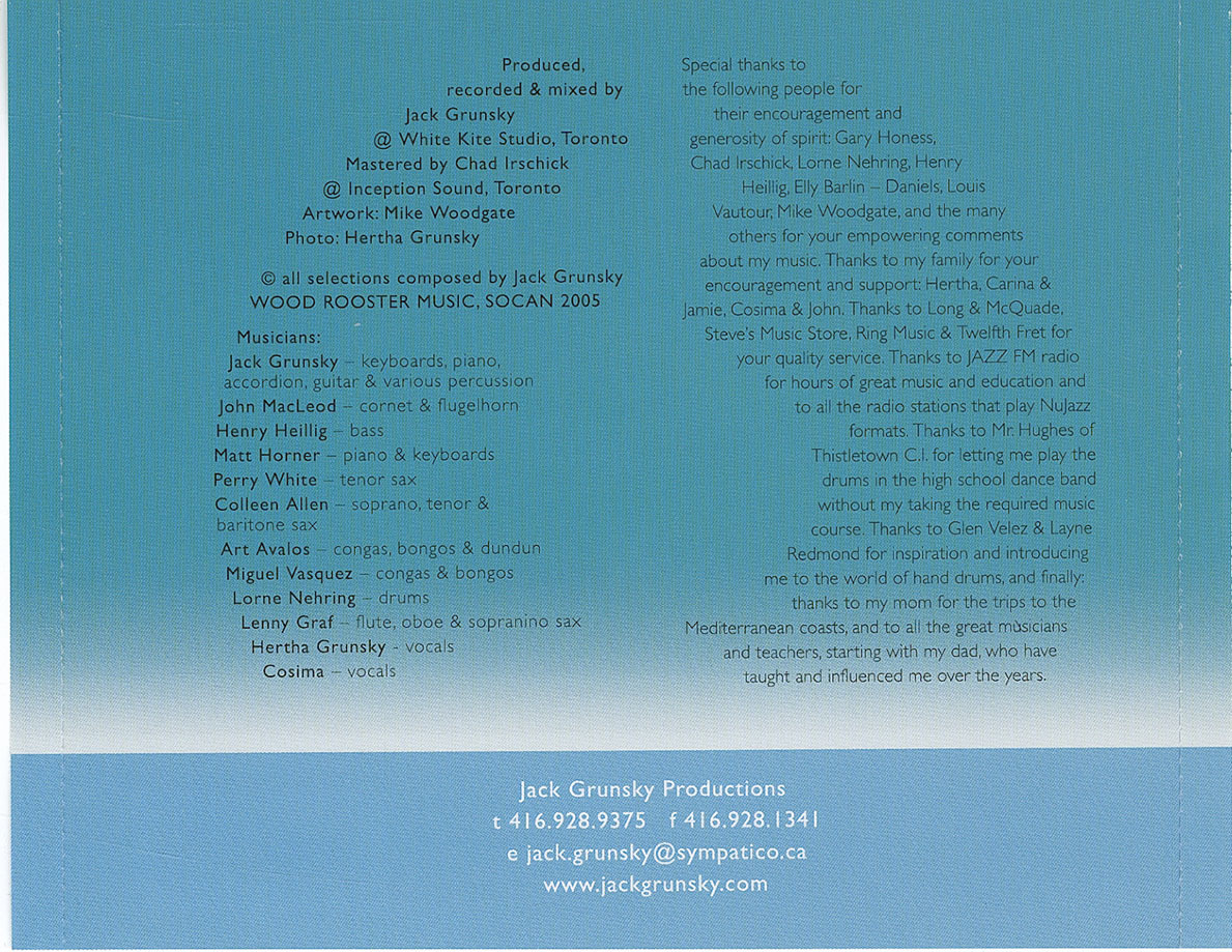 Jack's expertise extended beyond performance. As a producer and mixer, he collaborated with fellow artists, including Fred Penner, whose Sing With Fred won a JUNO Award. Jack also explored other genres, releasing Coastlines (2006), a NuJazz instrumental album, and Room To Move (2008), blending folk, jazz, and bossa nova.