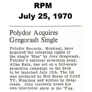 In 1977, Joey Gregorash reinvented himself under the alias Jay Anthony (Joey Anthony Gregorash) and signed with RCA Victor. Under this name, he released two singles: "Baby, Is There Something Going On b/w Would You Take it Nice" and "Love Lost Woman b/w Bad Time Girl".