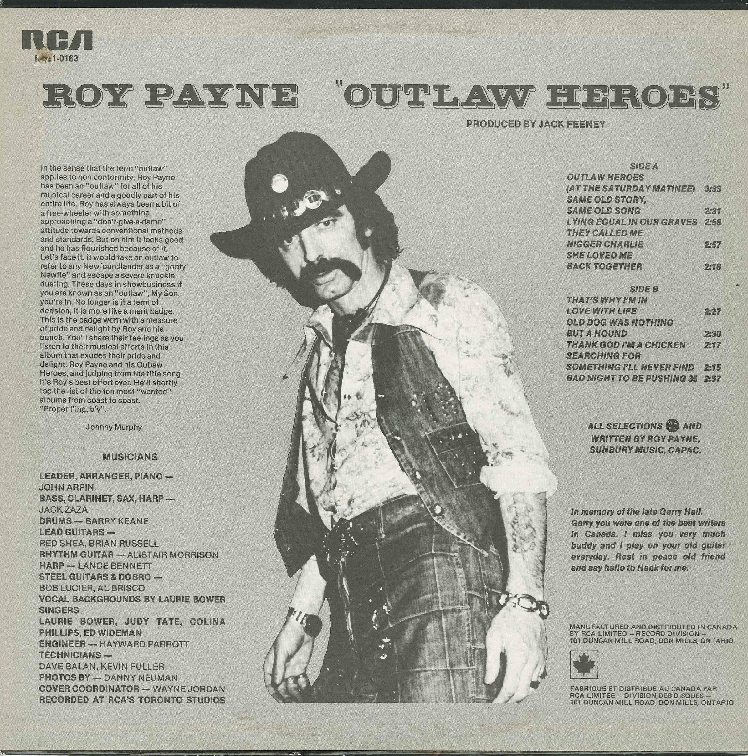 And his sound! I was being raised on Wilf Carter, Jim Reeves and Marty Robbins on my parents’ side. My sister was into the Stones and AM country while my brother was a true blue Dylan fan. I had it all coming at me and here suddenly was Roy Payne, sounding like some Newfoundland Banshee channeling a blend of Merle Haggard, Johnny Cash, George Jones, Kristofferson and Stomping Tom Connors! His guitar picking and bar room beat (although at my tender age I didn’t realize this aspect) was infectious. Real toe tapping stuff! This was before I grew into the sounds of The Who, Tull, T-Rex, Bowie and Zeppelin.
