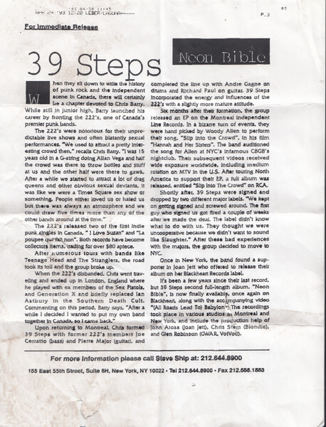 39 Steps came together in Montréal in 1984 when Chris Barry—fresh off the wreckage of The 222’s and a harrowing London stint—reunited with Pierre Major (guitar) and Joe Cerratto (bass), adding Richard Paul (guitar) and André Gagné (drums). Where the 222’s were a teenage punk broadside, 39 Steps sharpened the edges into something darker and cinematic: hard-charging, goth-tinged rock built for midnight clubs and last-chance shots. Within six months they were at Studio Victor cutting a self-titled EP for Line Records, with “Slip Into the Crowd” and “Sex in Miami” announcing the band’s balance of menace and melody. A move to New York under manager Steven Shipp followed, and an audition landed them on screen in Woody Allen’s Hannah and Her Sisters, performing “Slip Into the Crowd” at CBGB—an era that brought MTV rotation and a 1987 full-length, Slip Into the Crowd (RCA/TGO), before the major-label gears ground to a halt.
