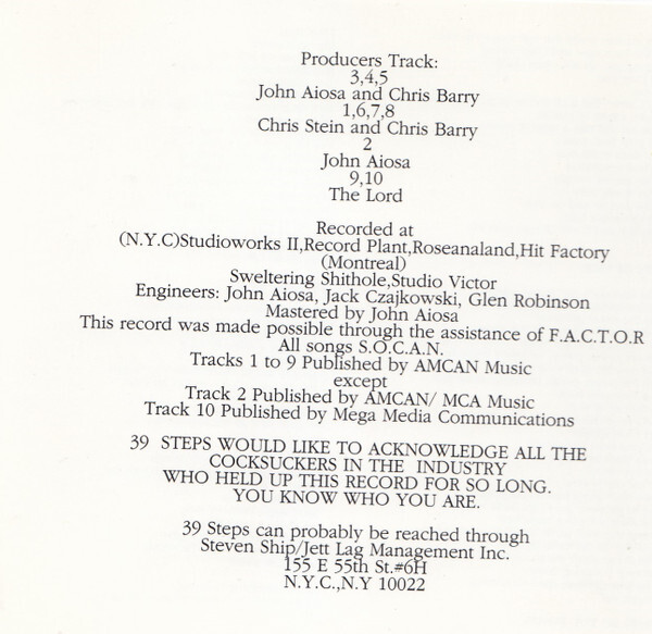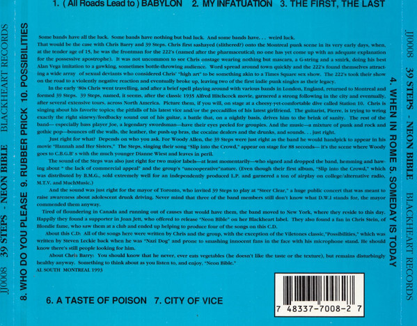 The stop-start churn of the late eighties is central to the band’s story. Dropped by RCA, they signed to Chrysalis in 1989 and tracked new material with Blondie’s Chris Stein, only to be stalled in an 18-month contractual headlock while the industry’s winds shifted. By the time they were clear, 39 Steps’ moment had cooled, though not their conviction. Joan Jett stepped in as a champion, and with producer John Alosa and engineer Glen Robinson, the band delivered Neon Bible in 1993 on Blackheart. “(All Roads Lead To) Babylon” pushed onto MTV, but grunge now set the dial; 39 Steps’ muscular aggro-rock felt out of sync with radio’s new order. Even so, the catalog endures—lean, bruised, and hook smart—capturing Montréal’s post-punk grit colliding with New York’s hard-rock charge.