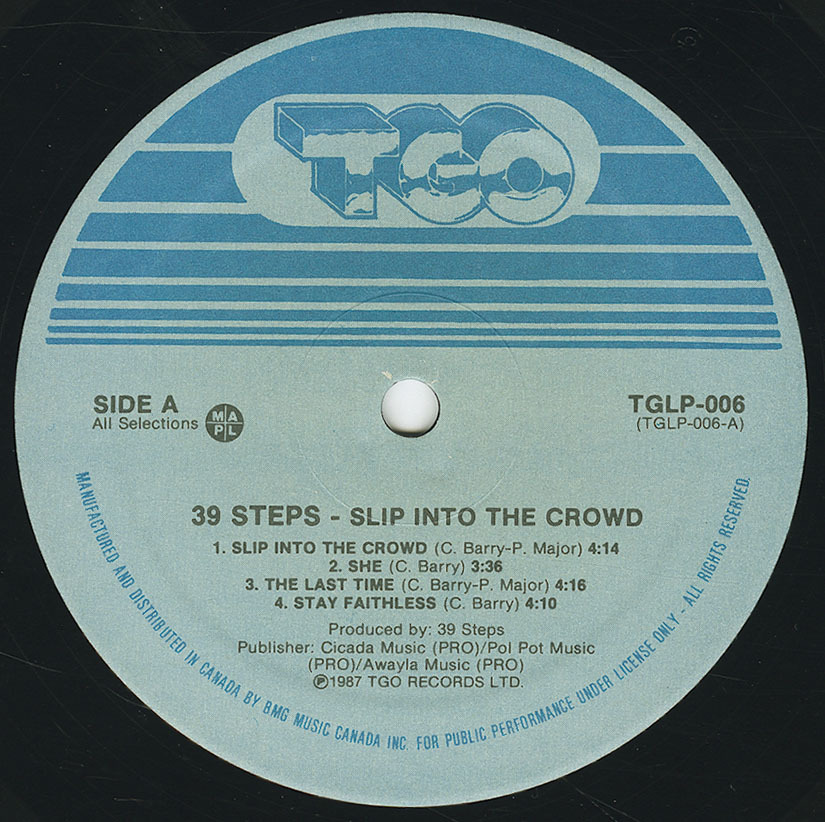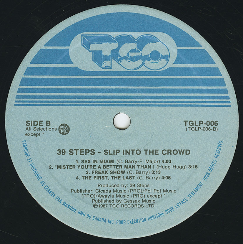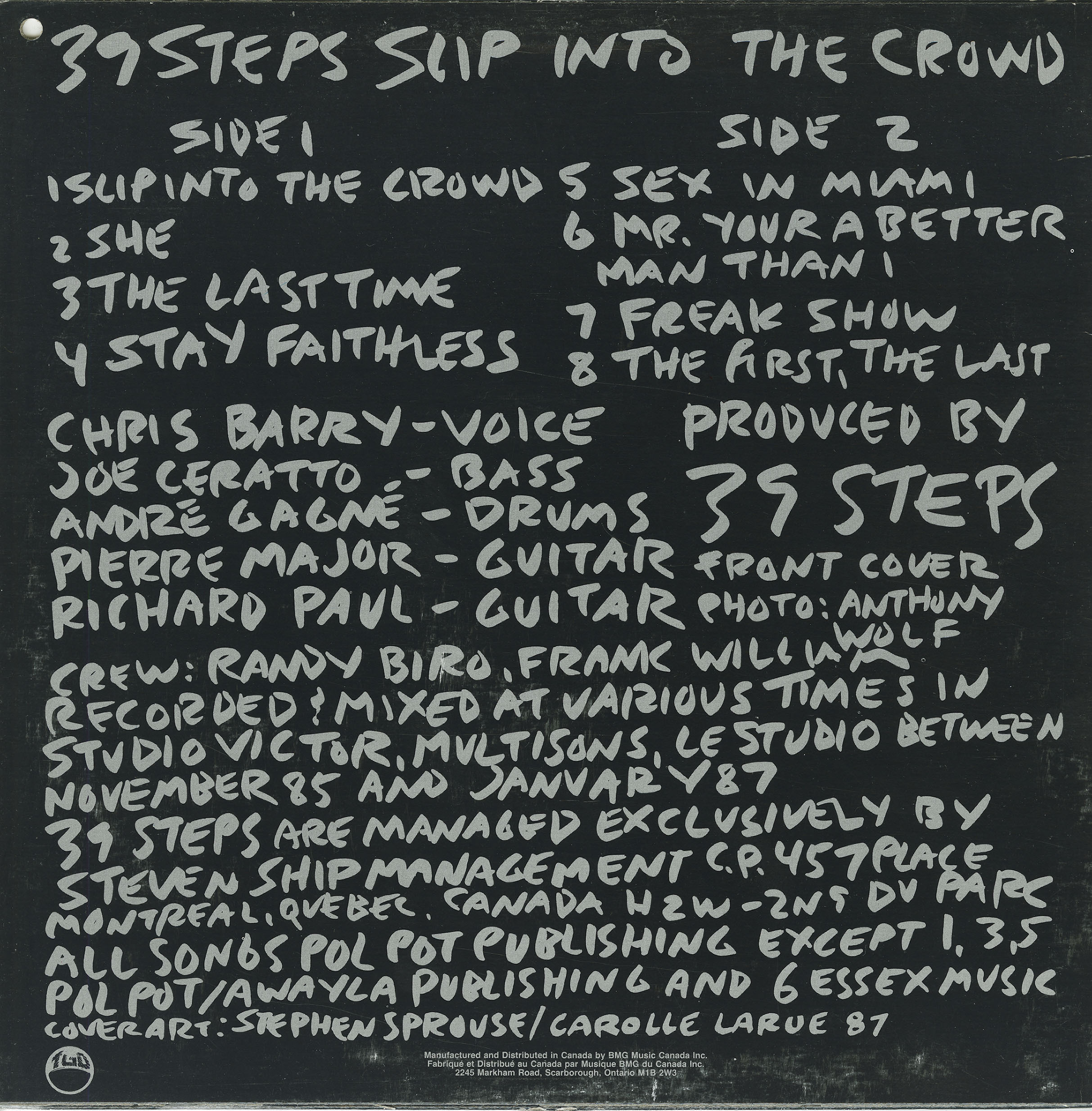 39 Steps came together in Montréal in 1984 when Chris Barry—fresh off the wreckage of The 222’s and a harrowing London stint—reunited with Pierre Major (guitar) and Joe Cerratto (bass), adding Richard Paul (guitar) and André Gagné (drums). Where the 222’s were a teenage punk broadside, 39 Steps sharpened the edges into something darker and cinematic: hard-charging, goth-tinged rock built for midnight clubs and last-chance shots. Within six months they were at Studio Victor cutting a self-titled EP for Line Records, with “Slip Into the Crowd” and “Sex in Miami” announcing the band’s balance of menace and melody. A move to New York under manager Steven Shipp followed, and an audition landed them on screen in Woody Allen’s Hannah and Her Sisters, performing “Slip Into the Crowd” at CBGB—an era that brought MTV rotation and a 1987 full-length, Slip Into the Crowd (RCA/TGO), before the major-label gears ground to a halt.