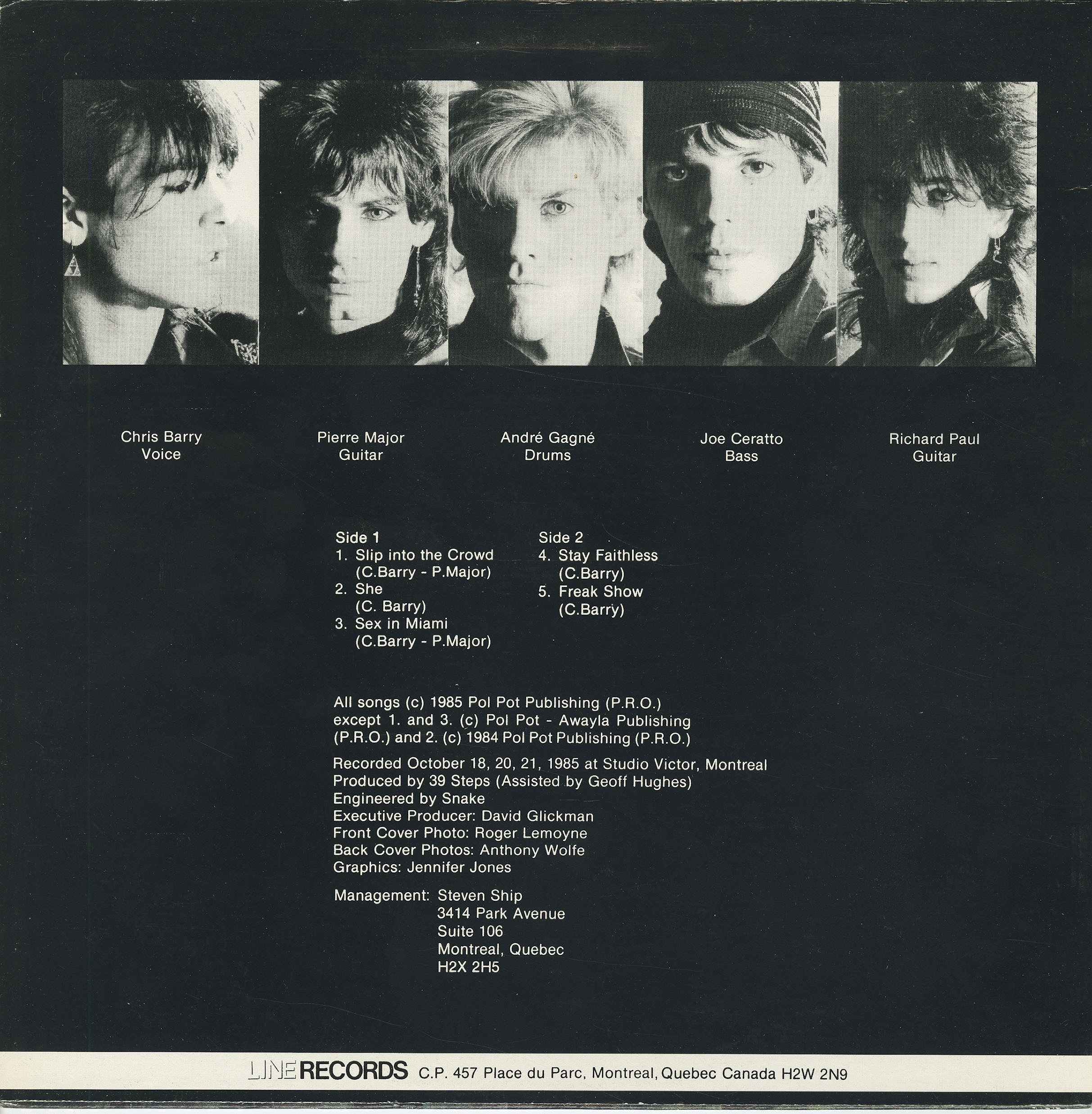 39 Steps came together in Montréal in 1984 when Chris Barry—fresh off the wreckage of The 222’s and a harrowing London stint—reunited with Pierre Major (guitar) and Joe Cerratto (bass), adding Richard Paul (guitar) and André Gagné (drums). Where the 222’s were a teenage punk broadside, 39 Steps sharpened the edges into something darker and cinematic: hard-charging, goth-tinged rock built for midnight clubs and last-chance shots. Within six months they were at Studio Victor cutting a self-titled EP for Line Records, with “Slip Into the Crowd” and “Sex in Miami” announcing the band’s balance of menace and melody. A move to New York under manager Steven Shipp followed, and an audition landed them on screen in Woody Allen’s Hannah and Her Sisters, performing “Slip Into the Crowd” at CBGB—an era that brought MTV rotation and a 1987 full-length, Slip Into the Crowd (RCA/TGO), before the major-label gears ground to a halt.