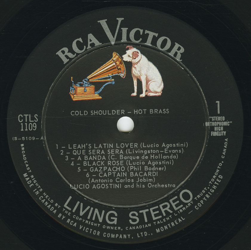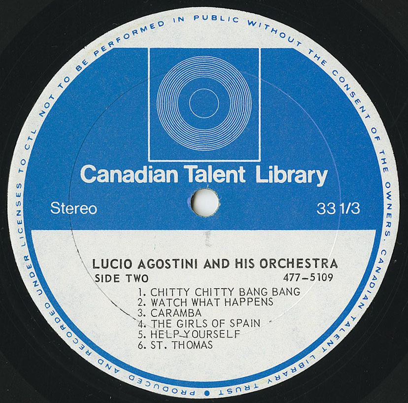 Agostini’s recordings for the Canadian Talent Library further showcased his versatility, with albums such as Mas Mucho Lucio (1968), which featured his original compositions Leah’s Latin Lover, Caramba, and Black Rose, and Cold Shoulder and Hot Brass, a brassy set of standards and originals. His centennial soundtrack Once Upon a Hundred Years (1967), recorded with Moe Koffman, Rob McConnell, Guido Basso, and other leading Canadian jazz musicians, remains a vibrant time capsule of the optimism and energy of 1960s Canada.