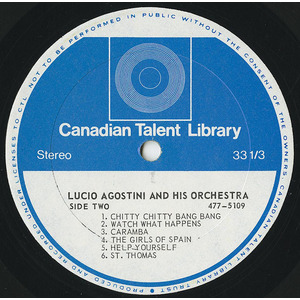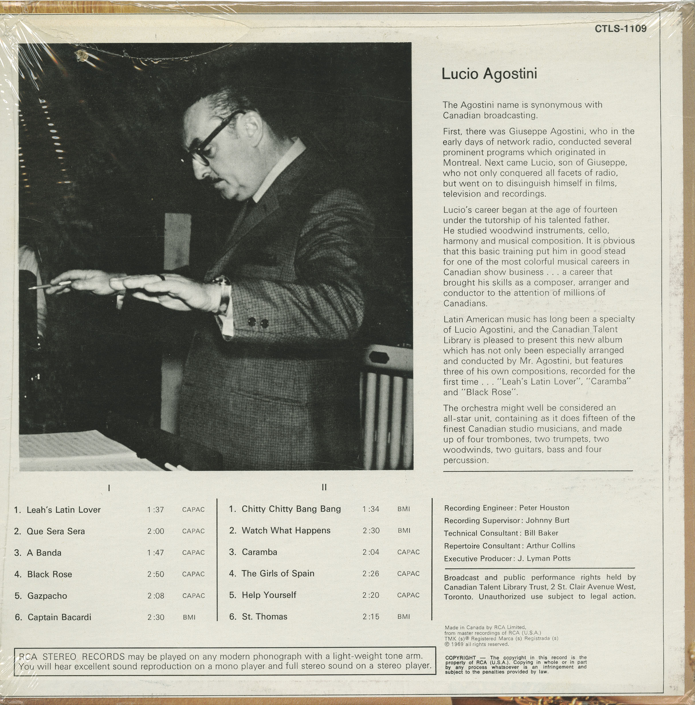 Latin American music has long been a specialty of Lucio Agostini, and the Canadian Talent Library is pleased to present this new album which has not only been especially arranged and conducted by Mr. Agostini, but features three of his own compositions, recorded for the first time . . . “Leah’s Latin Lover”, “Caramba” and “Black Rose”.