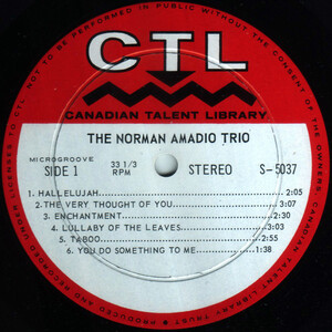 Amadio also led trios (usually, Bob Price, bass, and Alex Lazaroff, drums) at several Toronto lounges and was the orchestra leader 1987-8 at the Imperial Room of the Royal York Hotel. Concurrent to his club work, he was a member of many studio orchestras, music director for CBC TV's 'Music Hop' 1963-7 and for several CBC pop and country-music specials, and the pianist and an occasional soloist 1977-81 on the syndicated TV series 'Nashville Swing'. His discography includes The Norman Amadio Trio (1963, CTL CTLS-037), with Alleyne and the bassist Bill Britto, and other records as accompanist to Tommy Ambrose, Moe Koffman, and Phyllis Marshall.