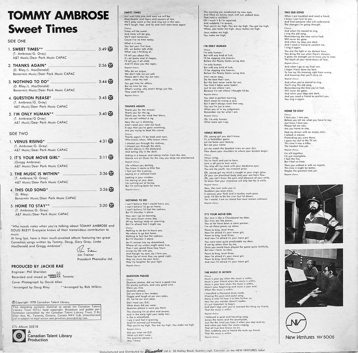During the 1970s and early 1980s, Ambrose returned to the stage and the studio with a renewed sense of artistic direction. His musical partnership with Doug Riley resulted in two albums for the Canadian Talent Library: Sweet Times (1977) and At Last (1979). Both records blended adult-pop songwriting with soul-jazz arrangements, offering a mature, emotionally honest sound. Tracks like “I’m Only Human,” “Home to Stay,” and “The Music Is Within” reflected his continued evolution as a singer and lyricist.