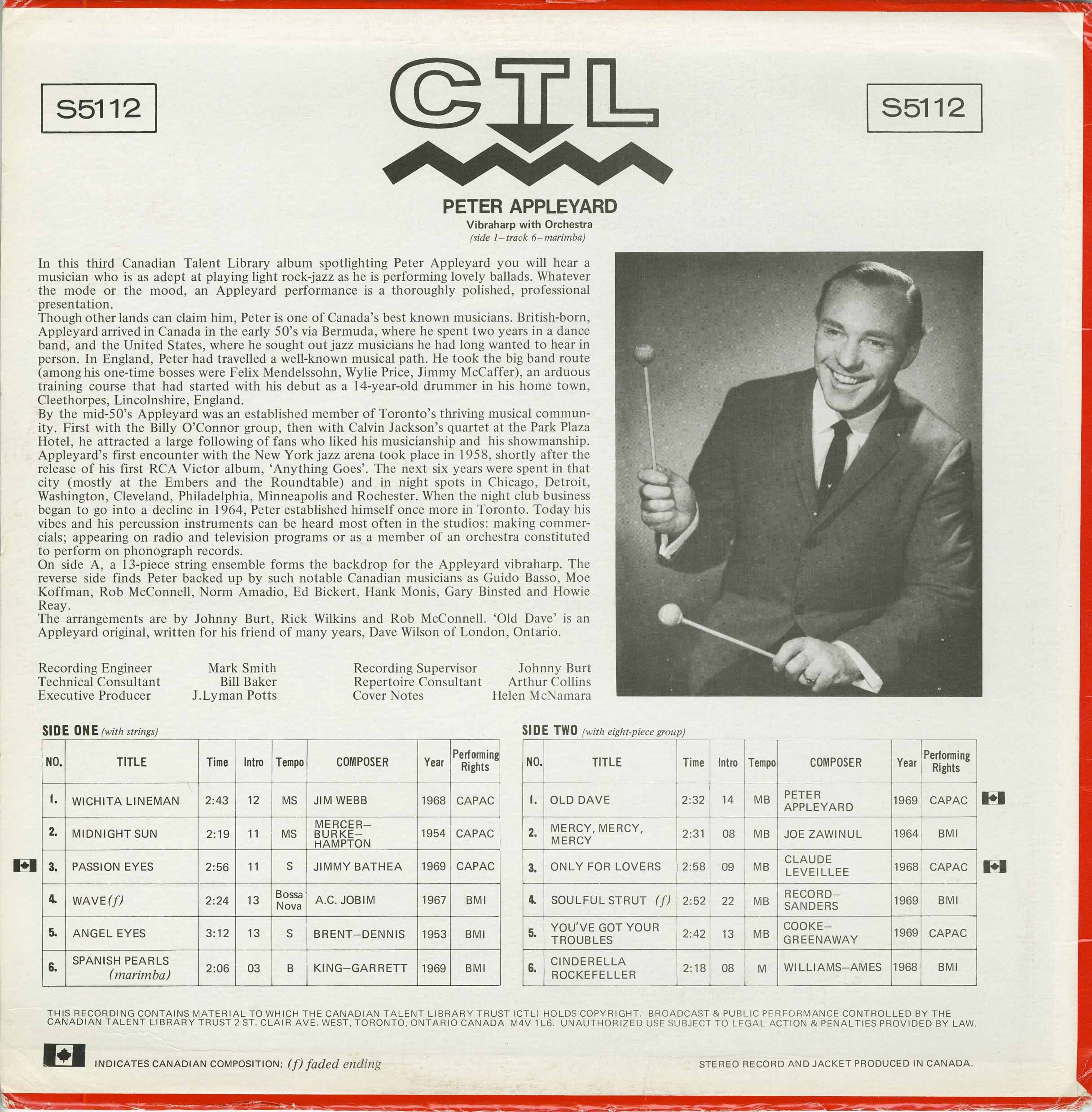 On side A, a 13-piece string ensemble forms the backdrop for the Appleyard vibraharp. The reverse side finds Peter backed up by such notable Canadian musicians as Guido Basso, Moe Koffman, Rob McConnell, Norm Amadio, Ed Bickert, Hank Monis, Gary Binsted and Howie Reynar.
