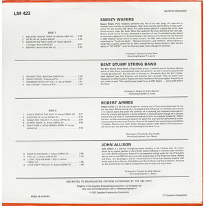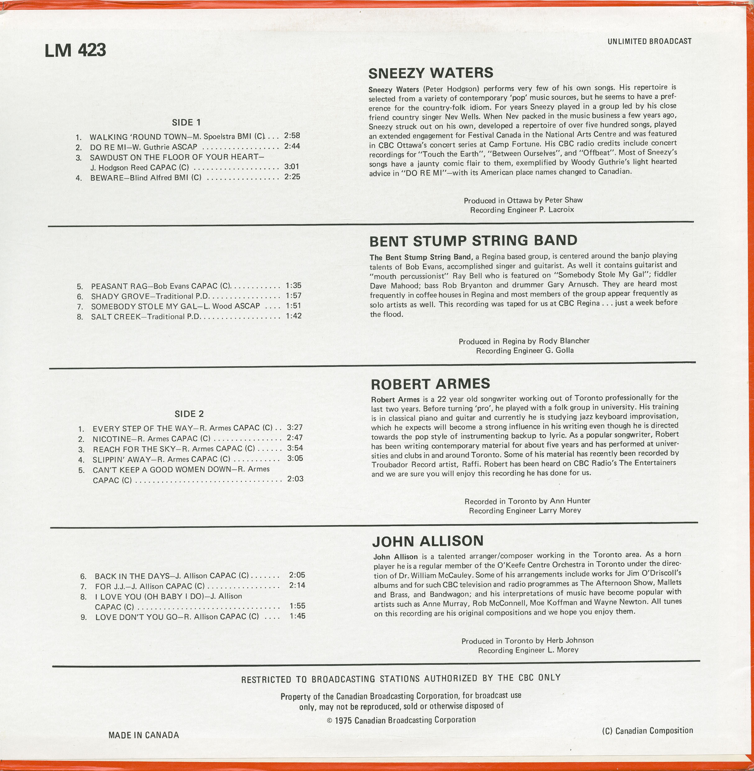 In 1975, the CBC included five of his songs—“Every Step of the Way,” “Nicotine,” “Reach for the Sky,” “Slippin’ Away,” and “Can’t Keep a Good Woman Down”—on the CBC Radio Canada album LM 423. The liner notes described him as a 22-year-old Toronto songwriter “attacking the pop style by instrumenting backup to lyric,” and noted that his songs had already been recorded by Raffi and broadcast on The Entertainers. This early recognition introduced Armes to the CBC’s national network of producers and marked his transition from campus folk performer to professional songwriter.