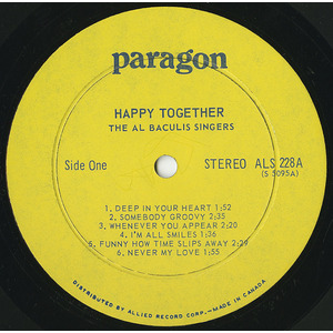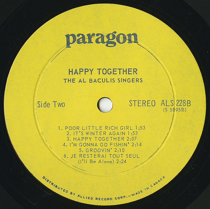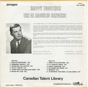 In the mid-1960s Baculis founded The Al Baculis Singers, an impeccably blended studio vocal group comprising Ray Berthiaume, Rudy Pontano, René Lacourse, Jean-Pierre Rondeau, Nicole Scott, Gisèle Poitras, Renée Beaumier, and Baculis’ wife, Margo MacKinnon. Bilingual and versatile, they became fixtures on CBC radio and television, known for their lush choral textures and polished phrasing. Their first LP, The Al Baculis Singers (Canadian Talent Library CTLS-1084 / Birchmount BM-528, 1966), introduced Baculis’ sophisticated pop-jazz arrangements to a national audience, followed by Back to Baculis—also issued as Happy Together (CTL CTLS-1095 / Paragon ALS-228, 1967)—and Anne of Green Gables (Dominion 1368, 1967). Blending flute, guitars, bass, drums, and vibraphone with eight vocal parts, these albums showcased a uniquely Canadian approach to the sunshine-pop era: urbane, harmonically rich, and radiantly melodic.