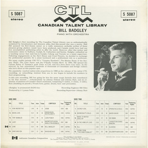 Bill Badgley’s first recording for The Canadian Talent Library was so enthusiastically acclaimed by broadcasters and listeners alike, that this second disc was a surety. Had Bill pursued his first-chosen career as a radio announcer, probably neither of these pleasure-giving platters would have been produced, and Canada would have had one less accomplished performing artist to offer the world. However, after disc jockey and newscaster stints in Sudbury, Guelph, St. Catharines and Sarnia, Badgley embarked on a teaching career that took him to Guelph, Coburg and Toronto as a music supervisor. Following engagements at the Hart House and Crest Theatre, he decided to exchange his professional pursuits for a piano keyboard and a professional role as a performer.