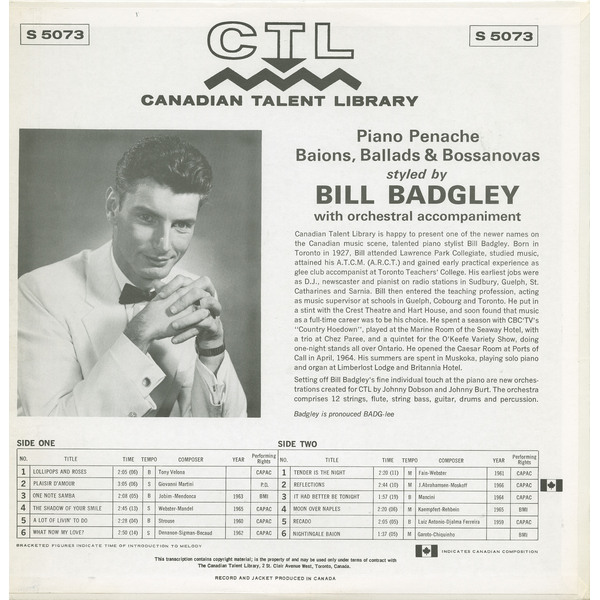 Canadian Talent Library is happy to present one of the newer names on the Canadian music scene, talented piano stylist Bill Badgley. Born in Toronto in 1927, Bill attended Lawrence Park Collegiate, studied music, attained his A.T.C.M. (A.R.C.T.) and gained early practical experience as glee club accompanist at Toronto Teachers’ College. His earliest jobs were as D.J., newscaster and pianist on radio stations in Sudbury, Guelph, St. Catharines and Sarnia. Bill then entered the teaching profession, acting as music supervisor at schools in Guelph, Cobourg and Toronto. He put in a stint with the Crest Theatre and Hart House, and soon found that music as a full-time career was to be his choice. He spent a season with CBC-TV’s “Country Hoedown”, played at the Marine Room of the Seaway Hotel, with a trio at Chez Paree, and a quintet for the O’Keefe Variety Show, doing one-night stands all over Ontario. He opened the Caesar Room at Ports of Call in April, 1964. His summer stints in Muskoka, playing solo piano and organ at Limberlost Lodge and Britannia Hotel.