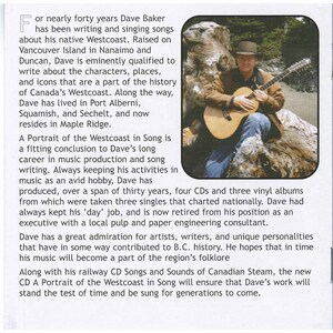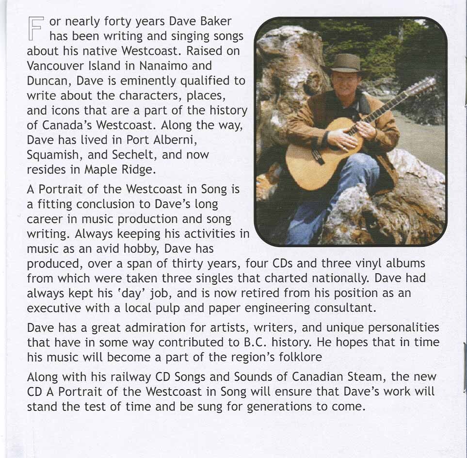 Dave has a great admiration for artists, writers, and unique personalities that have in some way contributed to B.C. history. He hopes that in time his music will become a part of the region’s folklore Along with his railway album Songs and Sounds of Canadian Steam, the new album a "Portrait of the Westcoast in Song" will ensure that Dave’s work will stand the test of time and be sung for generations to come.