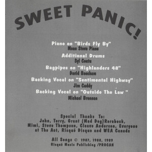 Their debut album Sweet Panic! was released in 1990 on Risqué Disque. Produced, recorded, and mixed by Terry Brown, and mastered by Bob Ludwig at Masterdisk, the album delivered a polished but grounded guitar-driven sound. Guest appearances included Jim Cuddy on backing vocals, along with other contributors. Despite strong musicianship and early support, the album struggled to achieve sustained national radio airplay. Risqué Disque collapsed later in 1990, limiting the album’s commercial reach.