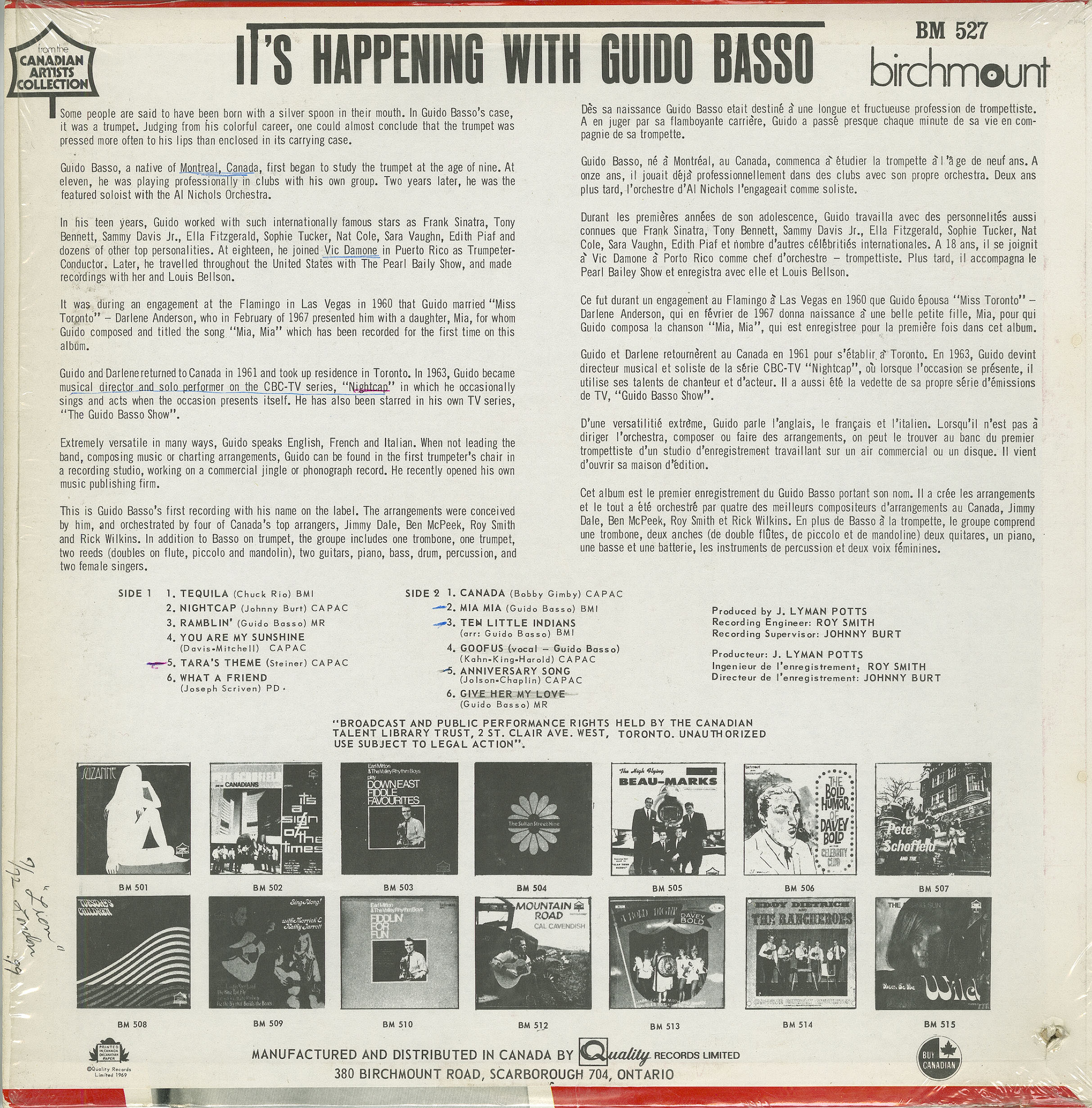 Manufactured and distributed in Canada by Quality Records Limited