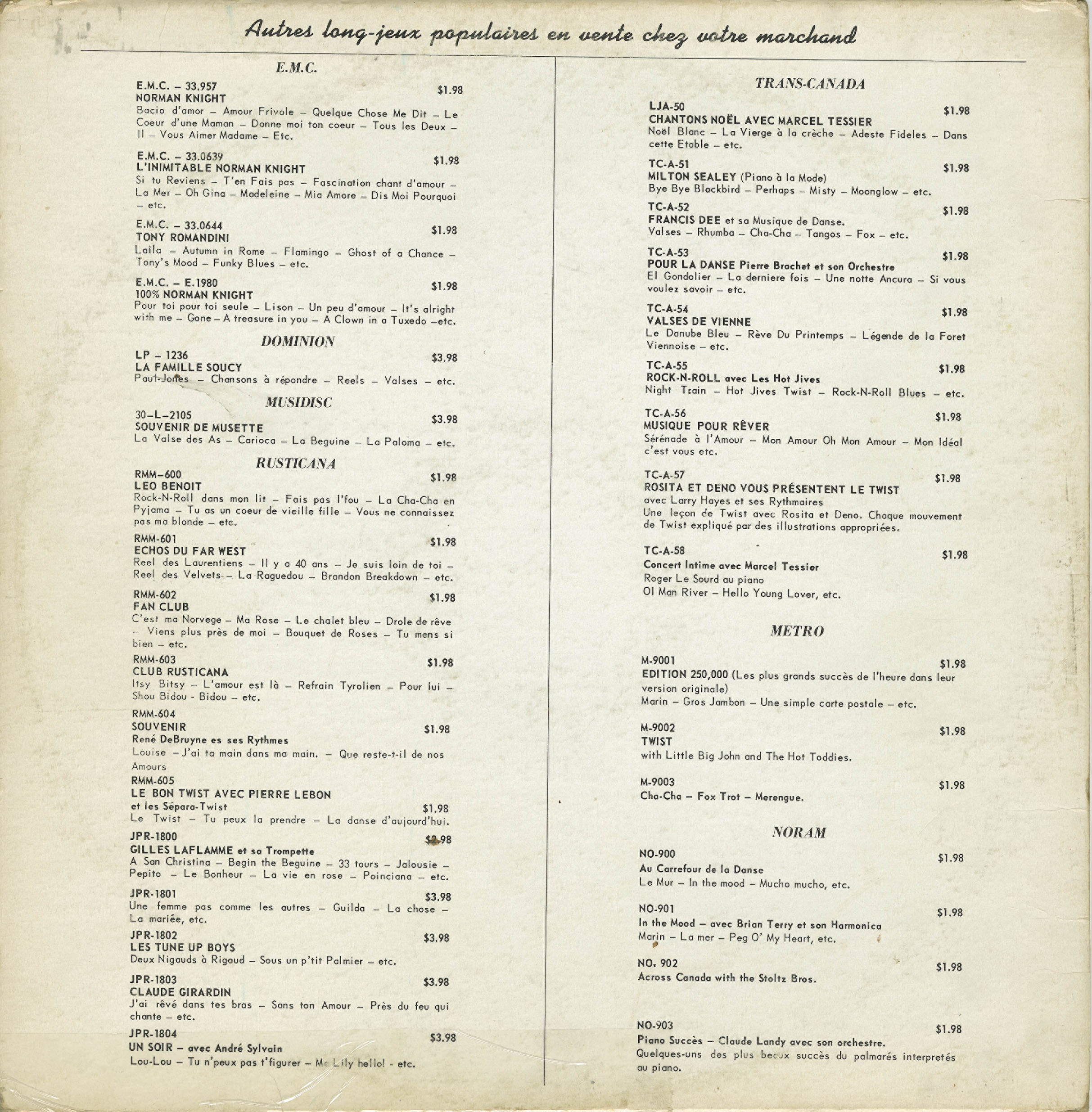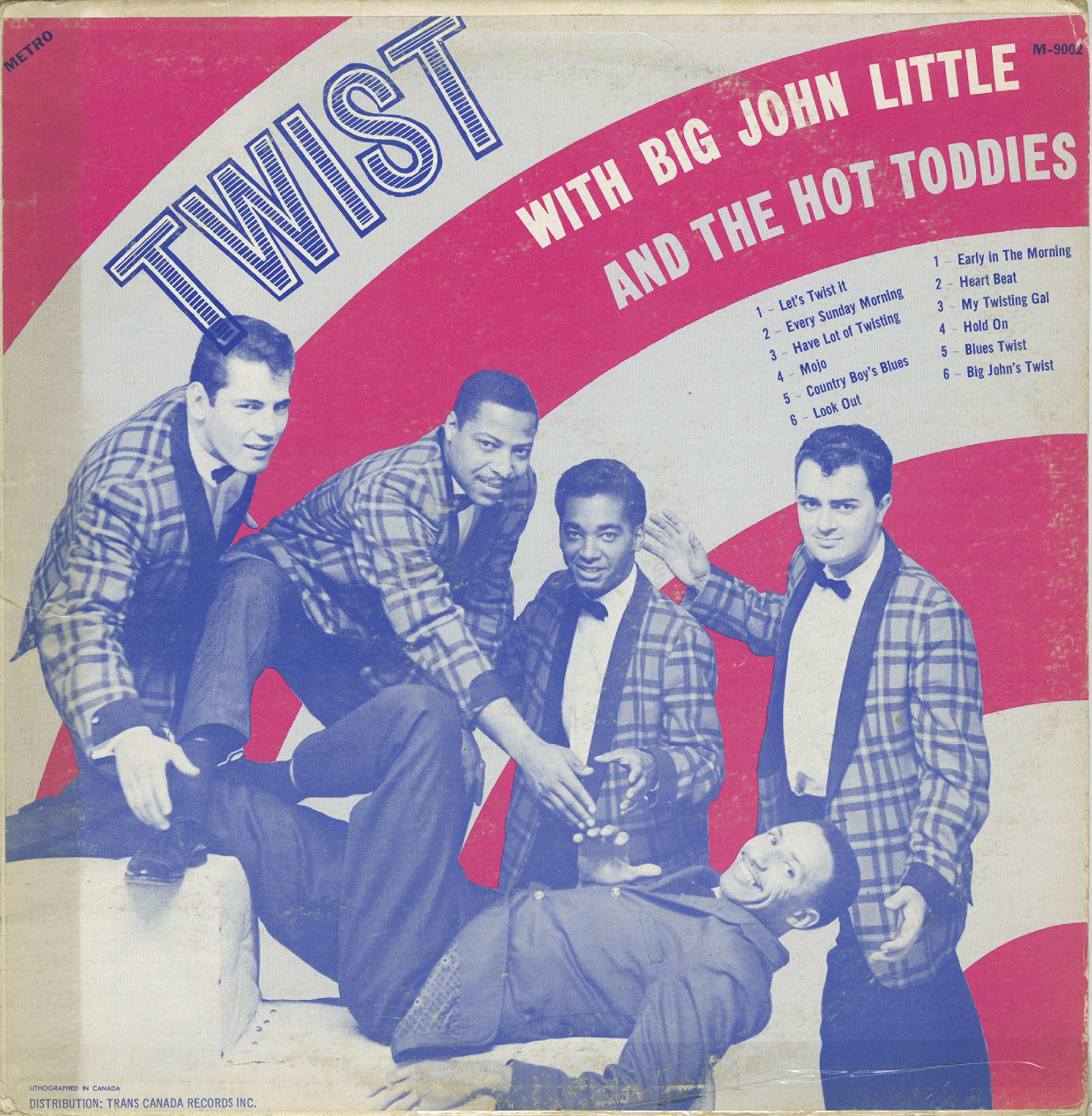 Big John Little & The Rockers were based in the Niagara Falls, ON area. By March, 1959 they became The Hot Toddies who immortalized the classic hit single: “Rockin’ Crickets” (which climbed to #57 on the Billboard charts and apparently was one of Jimi Hendrix’s favourite records!). The racially integrated line-up consisted of: Big John Little on vocals & guitar, Bill Parnell, Dennis Lynne on drums, Billy Cardner on bass and Pierre Lévesque from Sherbrooke, QC on organ. As The Hot Toddies, they cut several singles released on both sides of the Canada-US border, with the band touring from Cleveland, OH to the Atlantic coast. They criss-crossed Ontario and Quebec, playing from Val D’Or to Gaspe, during which time that Big John even taught himself to speak French. By early 1962, they were back in Montreal, hanging out and playing at The Esquire Show Bar & Rockhead’s Paradise while recording their sole LP. Released in March 1962 at the height of the twist boom on the budget Montreal label Metro (a subsidiary of Trans Canada Records), the album would also see a second repackaging in 1964 on Rusticana as Big John & The Beetlers at the outbreak of Beatlemania. The LP cover shows a picture of Big John Little laying down with Denny Fox at far left, and left to right: Richard Jordan, Billy Cardner and Pierre Lévesque.