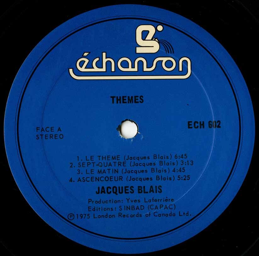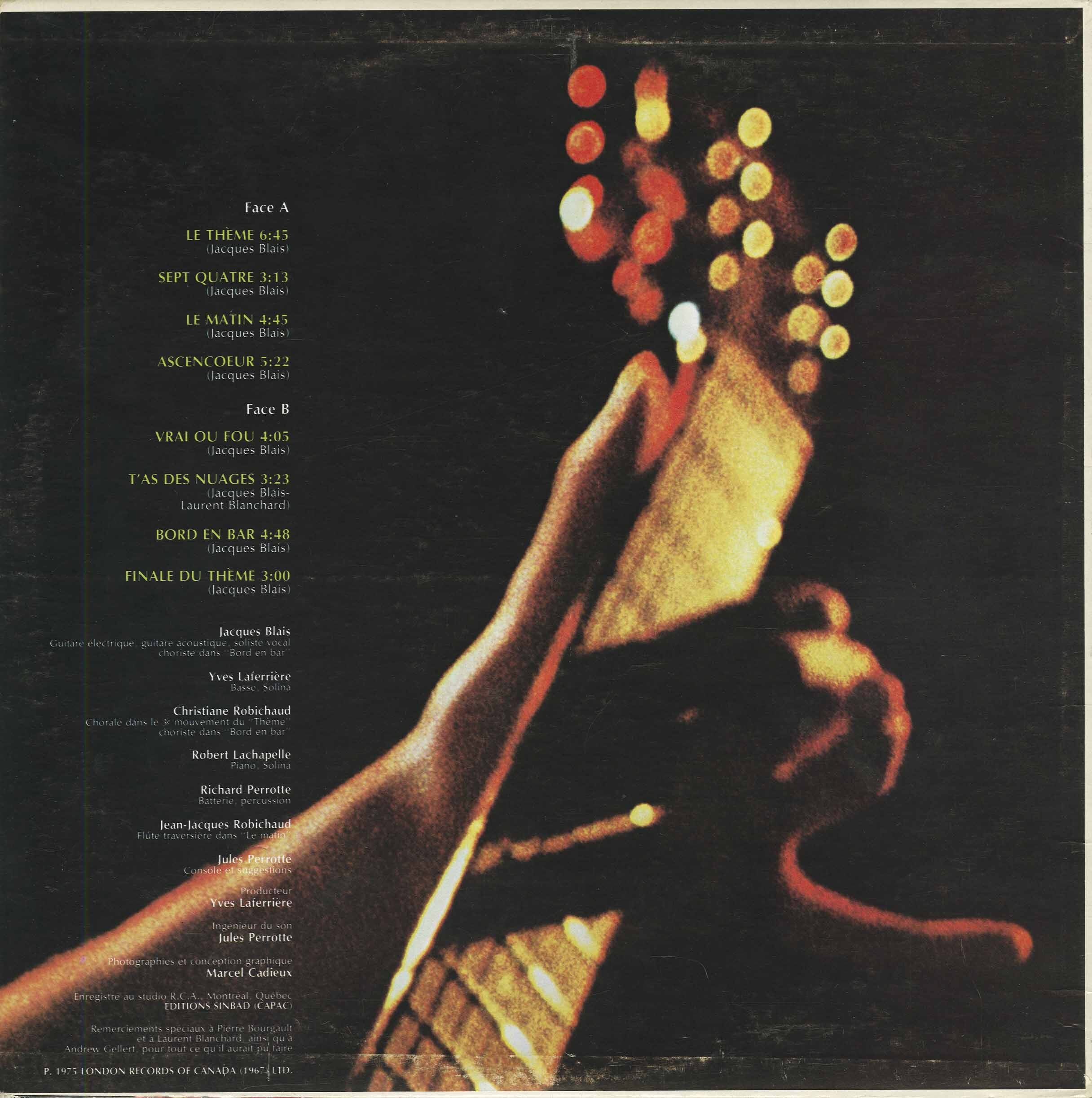 Released in March 1975, Thèmes was performed live with members of Contraction at L’Évêché, Hôtel Nelson, and during the St-Jean-Baptiste celebrations on Mont-Royal in June. Sept Quatre received heavy airplay on CHOM and CKVL, and the album was named Experimental Album of the Year by local media. In August, Blais performed before 7,000 spectators at the Chant’Août festival in Quebec City, alongside Offenbach, Pagliaro, and Aut’Chose.