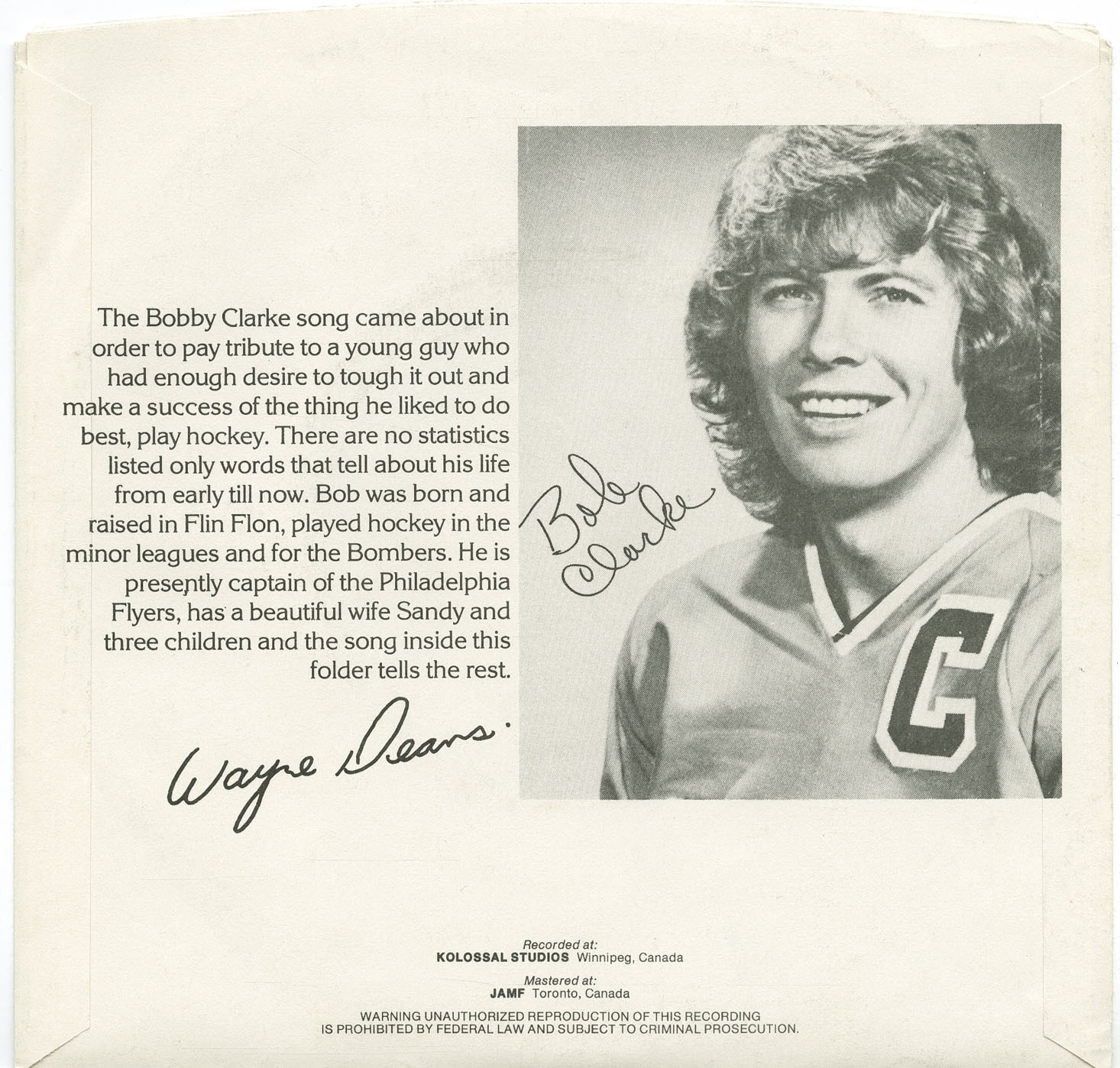 The song and accompanying sleeve notes focus on Clarke’s early development in Flin Flon, his minor league years, and his emergence as a star with the Philadelphia Flyers, where he became team captain and one of the defining players of the franchise’s most successful era. The record presents Clarke not just as a celebrity athlete, but as a family man and hometown figure whose success remained closely tied to his northern roots.