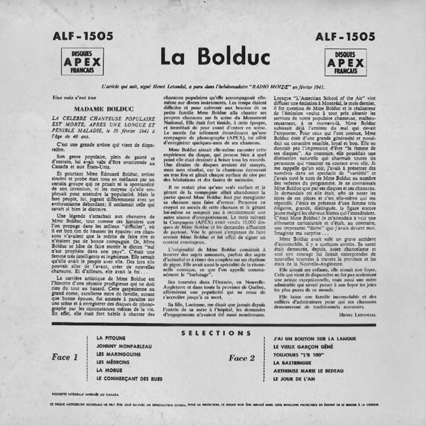 In 1941, the final curtain came down on the singer who was known simply as "La Bolduc." Her songs made her an idol to the underprivileged of her day; today they are touching a new audience of francophone Canadians rediscovering their musical heritage.