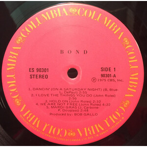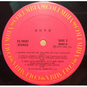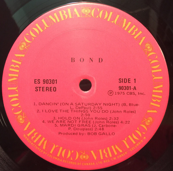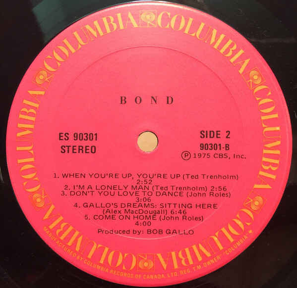 They did the usual Southern Ontario club circuit with a focus on British rock and a few original tunes. Their line-up changed over the years, but the most successful was Dunn, Roles, Hamilton, Trenholm, and MacDougall. Eventually, they signed with CBS in 1974 and in 1975 released their Bob Gallo produced eponymous debut album which was recorded at Manta Sound. The lead-off single "Dancin' (On A Saturday Night)", was a surprise hit that made the Top-20 in Canada. They did an Eastern Canadian tour with The Stampeders and a short lived cross Canada tour. And yet, the record unfortunately left many radio programmers with the image that Bond was a bubblegum act and follow-up singles, including "When You're Up, You're Up", were virtually ignored.