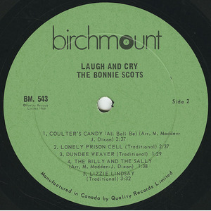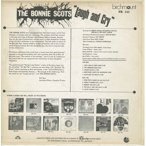 The good-humoured "Ranger's and Celtic" rivalry of the boys creeps into the old ballad "All Bali Be". Liberties are also taken with "Scotland 'Ra Brave" which, according to Mick and Jackie, is the "land of Pakistannis, Andy Capps and Setterday Sannies…" But enough of this blethering. Stick the record on and "Laugh and Cry" with THE BONNIE SCOTS.