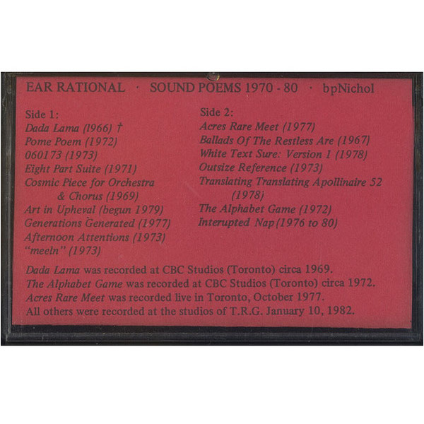 Ear Rational contains all the single voice pieces i composed in the years 1970 thru 1980 other than sections of The Martyrology Bk V & a part of the May Day Book. In addition i have included: a live recording of the only seven voice piece I've done, Acres Rare Meet; an alternate version of Dada Lama, previously unreleased; the first adequate realization of my composition Cosmic piece for Orchestra & Chorus; and the only remaining unrecorded single voice text from the 60's - Ballads Of The Restless Are. In the seventies I put the bulk of my energy in sound into composing for & with the Four Horsemen. In the single voice pieces the interest began to shift toward the more narrative & prose-based concerns evident in the most recent compositions on this tape, Interupted Nap & Art In Upheaval. This cassette is dedicated to Steve McCaffery, my partner in the C rimes in both the Toronto Research Group & the Four Horsemen. bpNichol, Toronto, January 1982