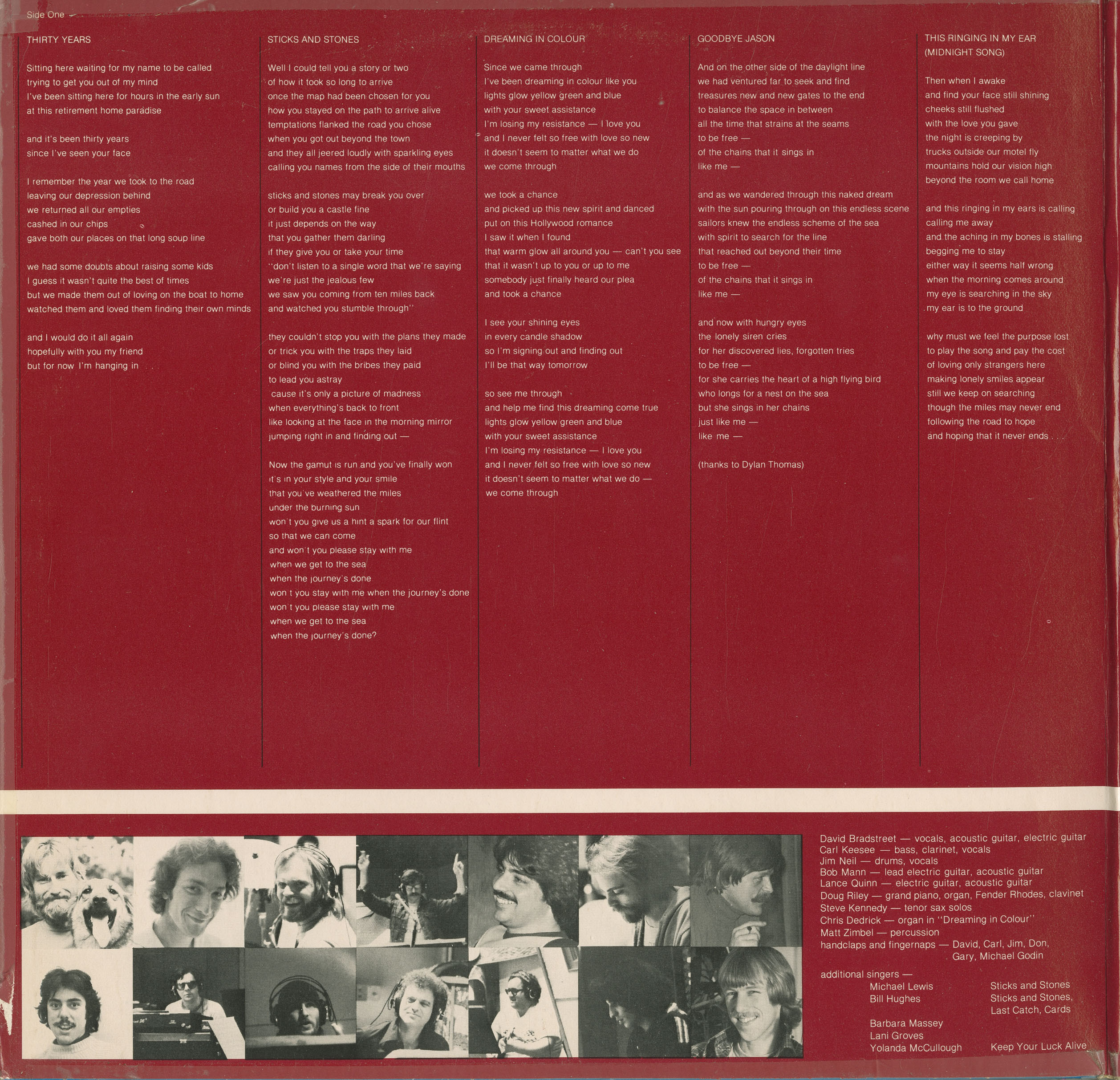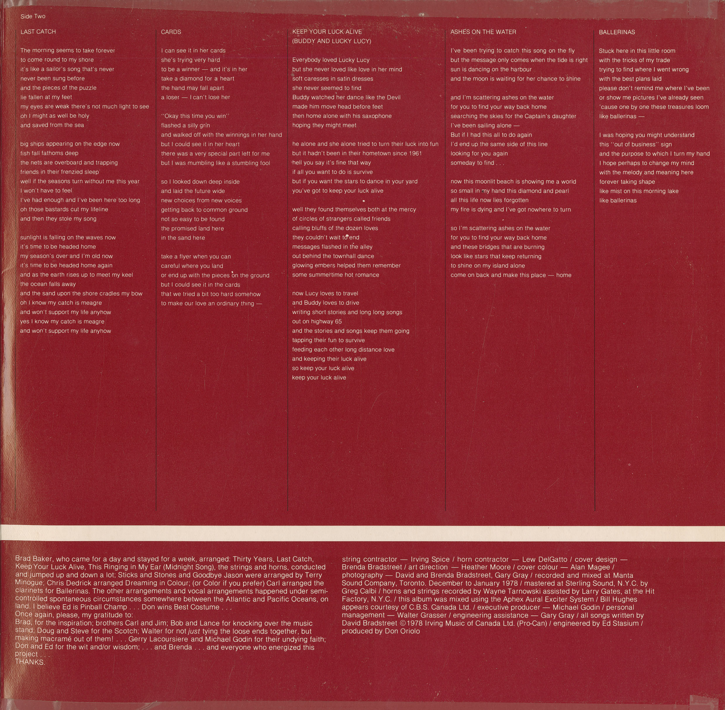 Brad Baker, who came for a day and stayed for a week, arranged ‘Thirty Years,’ ‘Last Catch,’ ‘Keep Your Luck Alive,’ and ‘This Ringing in My Ear (Midnight Song),’ as well as the strings and horns, conducted, and jumped up and down a lot. ‘Sticks and Stones’ and ‘Goodbye Jason’ were arranged by Terry Minogue; ‘Dreaming in Colour’ (or ‘Color’ if you prefer) was arranged by Chris Dedrick; ‘Ballerinas’ was arranged by Carl. The other arrangements and vocal arrangements happened under semi-controlled spontaneous circumstances somewhere between the Atlantic and Pacific Oceans, on land. I believe Ed is Pinball Champ. J. Don wins Best Costume.
