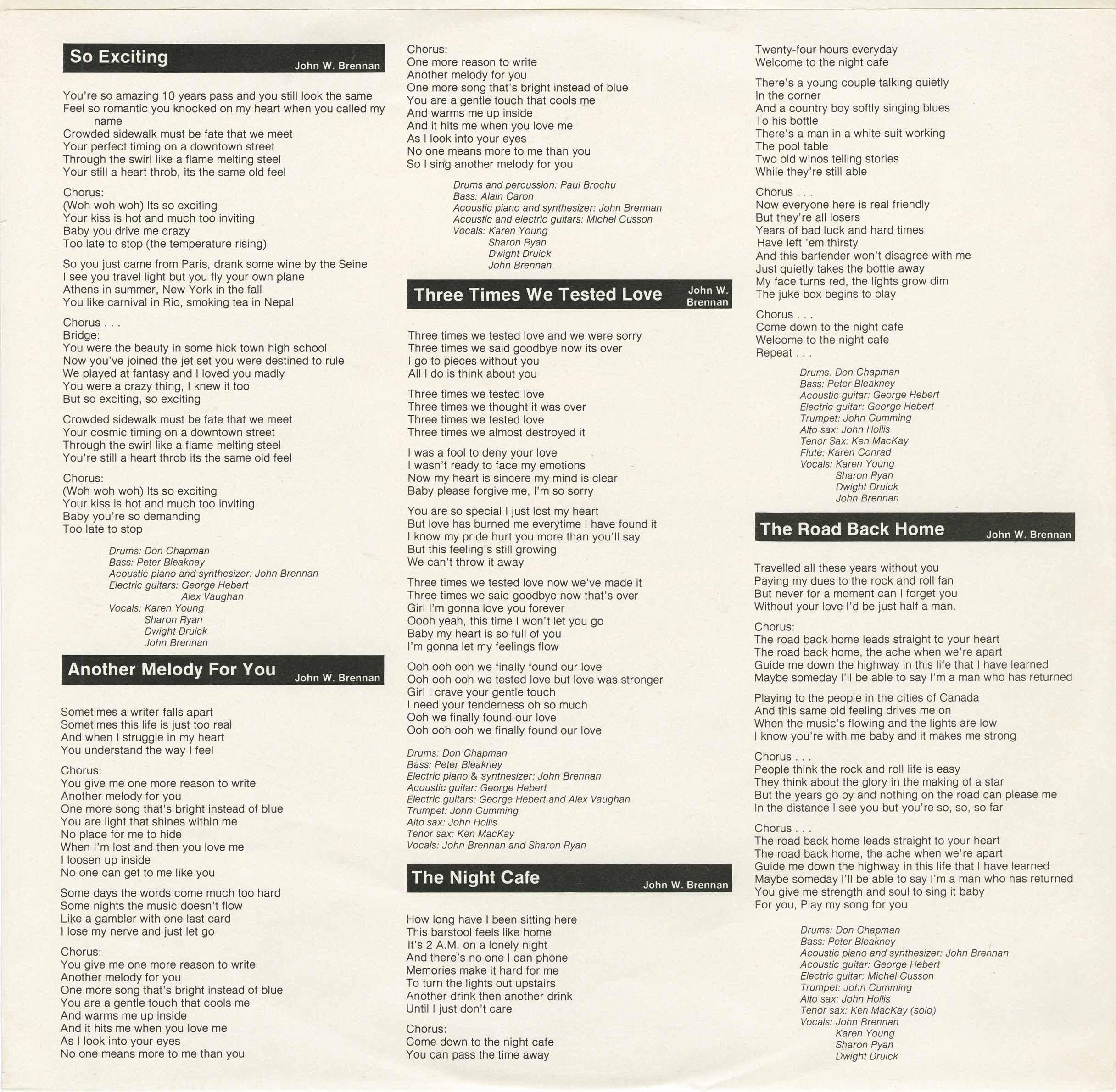 This debut album—often referred to by its unofficial title The Road Back Home—was a showcase of Brennan’s compositional and vocal versatility. Songs like “So Exciting,” “Three Times We Tested Love,” and “Sarah” highlighted his smooth, soulful delivery, while the title track reflected his lyrical sensitivity and cinematic approach to arrangement. The sessions featured some of Canada’s finest musicians, including Michel Cusson, Alain Caron, and Paul Brochu (of the celebrated jazz-fusion group UZEB), alongside George Hebert, Alex Vaughan, Peter Bleakney, Roger Walls, and Karen Young, blending Maritime and Québec musical talent into a sophisticated pop-jazz hybrid.