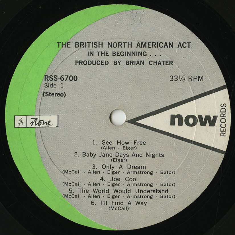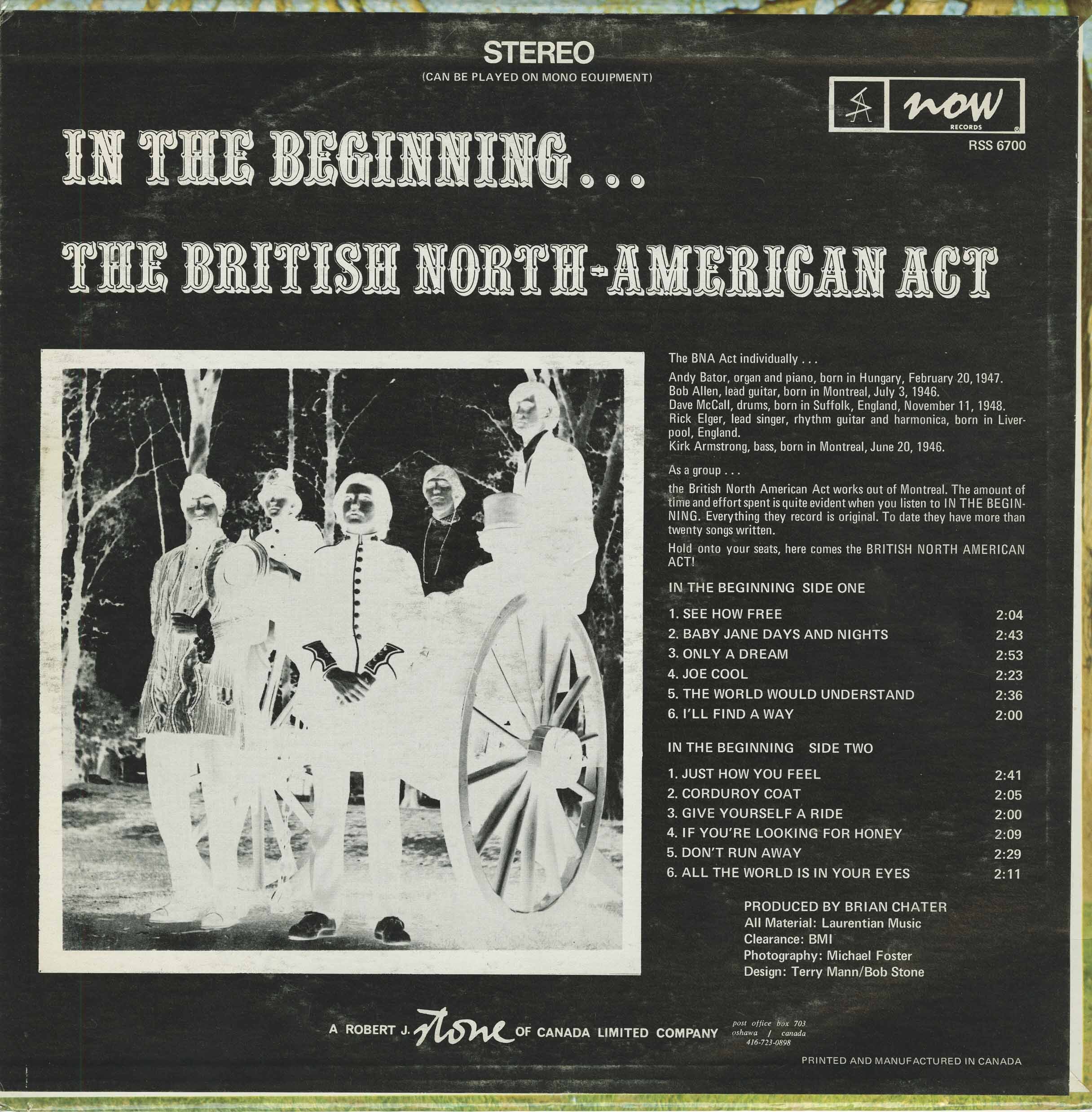 The British North-American Act formed in Montréal, Québec in 1968 and shortly thereafter they recorded an album of all original material "In The Beginning...", their only album, on Now Records in 1969. It was accompanied by the single "The World Will Understand b/w Joe Cool" on Now Records RS 600. The British North-American Act were Andy Bator, born in Hungary on February 20th, 1947 on organ and piano; Bob Allen, born in Montreal on July 3rd, 1946 on lead guitar; Dave McCall, born in Suffolk, England on November 11th, 1948 on drums; Rick Elger, born in Liverpool, England on rhythm guitar, harmonica and lead singer; and Kirk Armstrong, born in Montreal on June 20th, 1946 on bass.