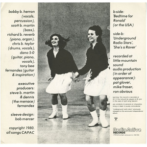 Mike Murray (keyboards on “She’s a Raver”), Doug Cass, Dense Milt, Ellie O’Day, Steve (Mac the Hack) and the Pointed Sticks, Fionna McQuarrie, Nigel & Louise, Mr. Lashman, Nancy, Mike (roadie), Scott, Feurst, The Captain, Tin Twist, Gerry B. Barad, Sam, Joey, Shithead, Tred Photos, Ronald Reagan, CITR, Theresa, Deb (for dancing), Catherine, Keith, Puppet, and “the name B-Sides.”