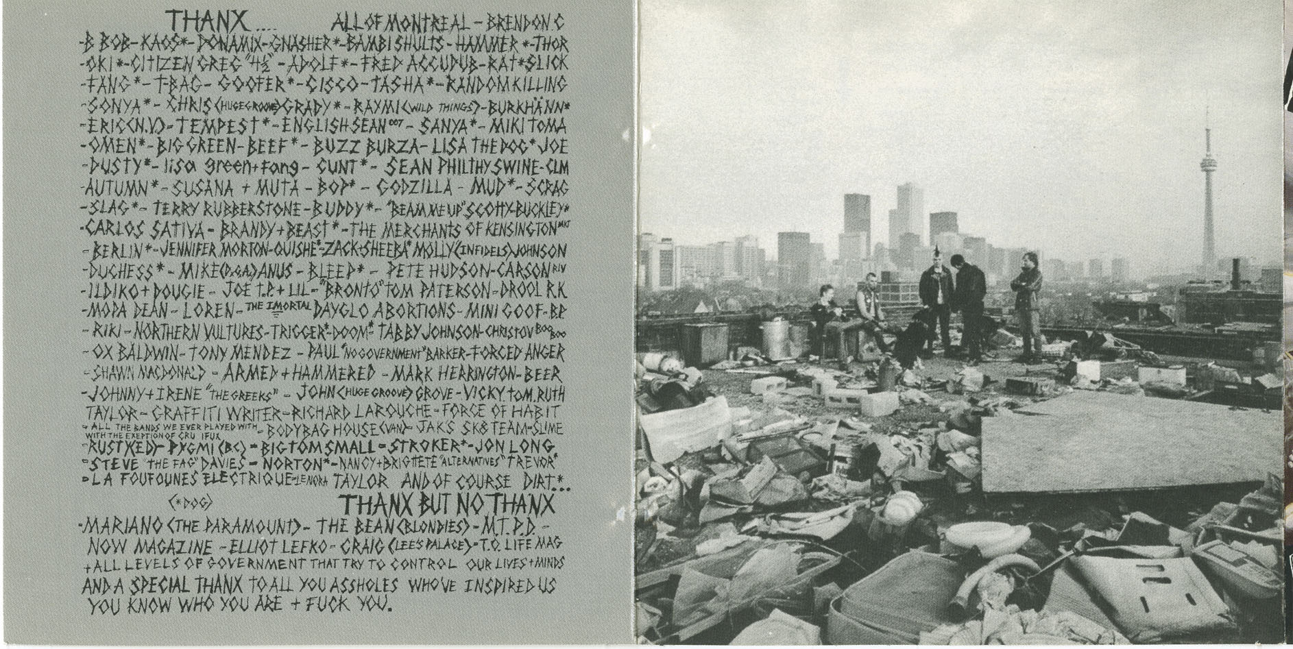 Central to the band’s early history were two long-running communal spaces: a Baldwin Street residence known as Fort Goof (active from July 1983 to July 1988) and later a warehouse at 26A Oxford Street, referred to as Goof World, which operated until May 5, 1991. These spaces became hubs for an extended network of Toronto punk and hardcore bands and served as informal venues, rehearsal spaces, and gathering points for the scene. Several bands either formed directly from or were closely associated with this environment, including 4½ Reasons for Retroactive Abortion, Brutally Honest, Ded Fuck, No Identity (No I.D.), Blasphamy, Nunoyerfuckinbiziness (N.F.B.), Armed and Hammered, B. Bob’s Banned, Verboten, and PolitiKILL inCOREct. Members and affiliates of Bunchofuckingoofs later intersected with bands such as Random Killing.