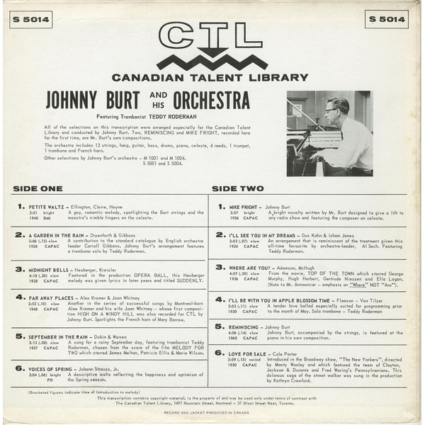 All of the selections on this transcription were arranged especially for the Canadian Talent Library and conducted by Johnny Burt. Two, REMINISCING and MIKE FRIGHT, recorded here for the first time, are Mr. Burt’s own compositions.