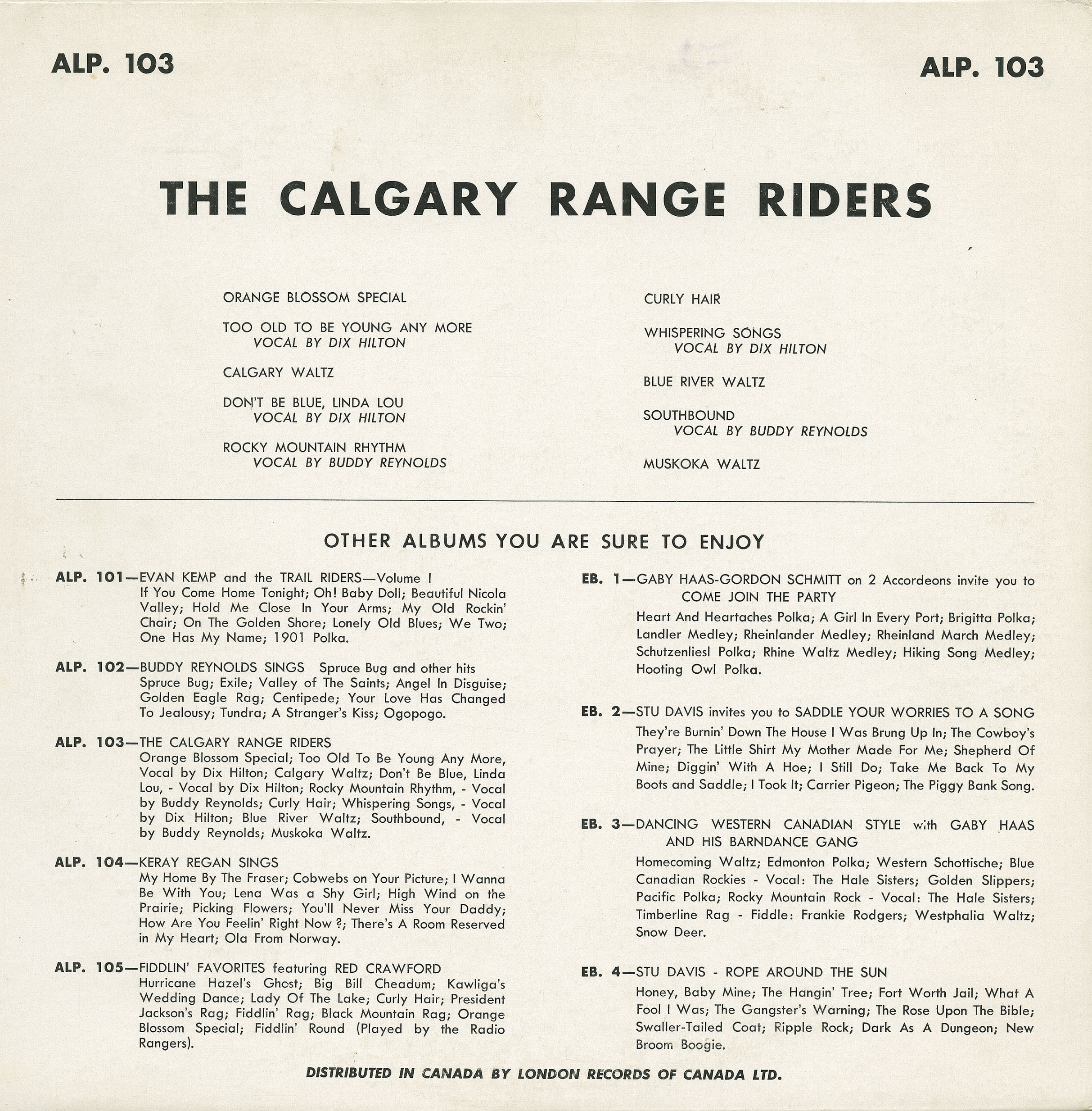 The Range Riders recorded for both Aragon Records in Vancouver and Apex Records in Toronto. Their Aragon debut (catalog 201) paired “Don’t Be Blue, Linda Lou” with “Calgary Waltz,” followed by “Orange Blossom Special” / “Too Old to Be Young Anymore.” On Apex, they issued “Thousand Miles at Sea” / “Careless Ways” and “Reward” / “Midnight Waltz.” Hilton wrote most of the group’s material and claimed to have composed over two hundred songs, many inspired by prairie life and maritime imagery from his years stationed on Canada’s coasts.