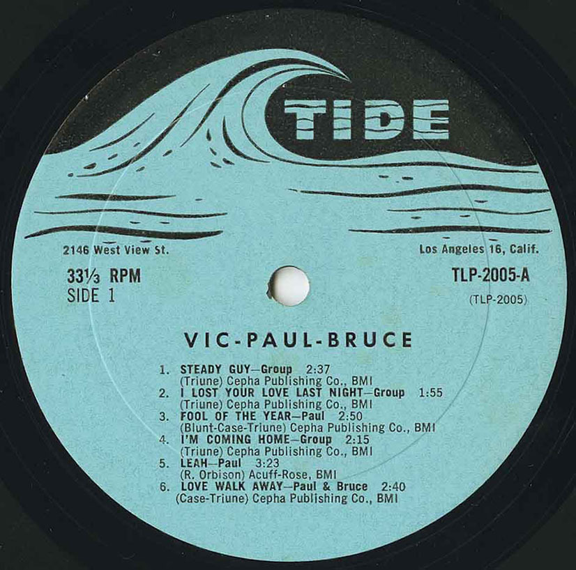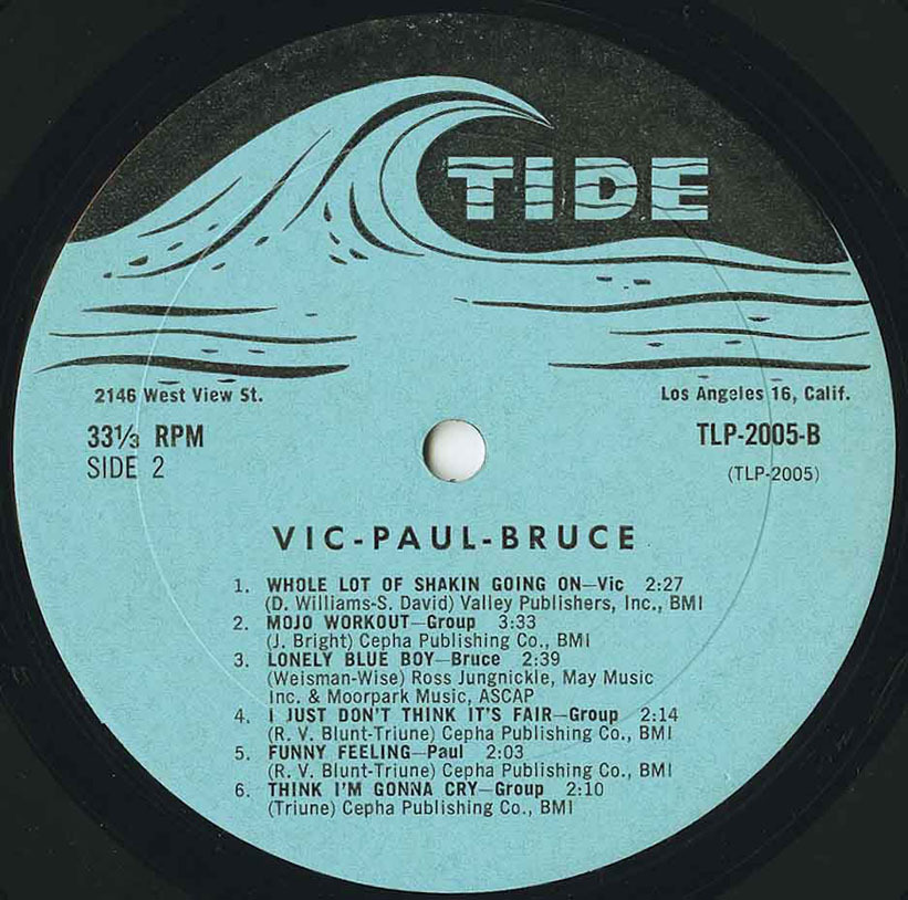 We eventually returned to Milwaukee and the band broke up. Denny King, guitarist and leader of the Darnells, went back out to L.A. in early 1964, and invited Vic Blunt (aka Vic Miller), guitarist and leader of the Blue Echoes, to join him as bassist. Blunt and King recorded for Tide as the Mojo Men. (This record has no connection with any other Mojo Men; it was just Tide’s way of trying to get more mileage out of that name, since Larry Bright’s “Mojo Workout” was their only national chart record). Both sides are instrumental, except for Blunt’s Jackie Gleason impression of “And away we go” to kick off the A-side. Blunt then left a tape of his Blue Echoes with Tide owner Ruth Christy (aka Ruth Stratchborneo) and returned to Sarnia. A few months later Christy sent for the group and they came to Los Angeles with Blunt on guitar and vocals, Paul Case on drums and vocals and Bruce Pollard on bass and vocals.