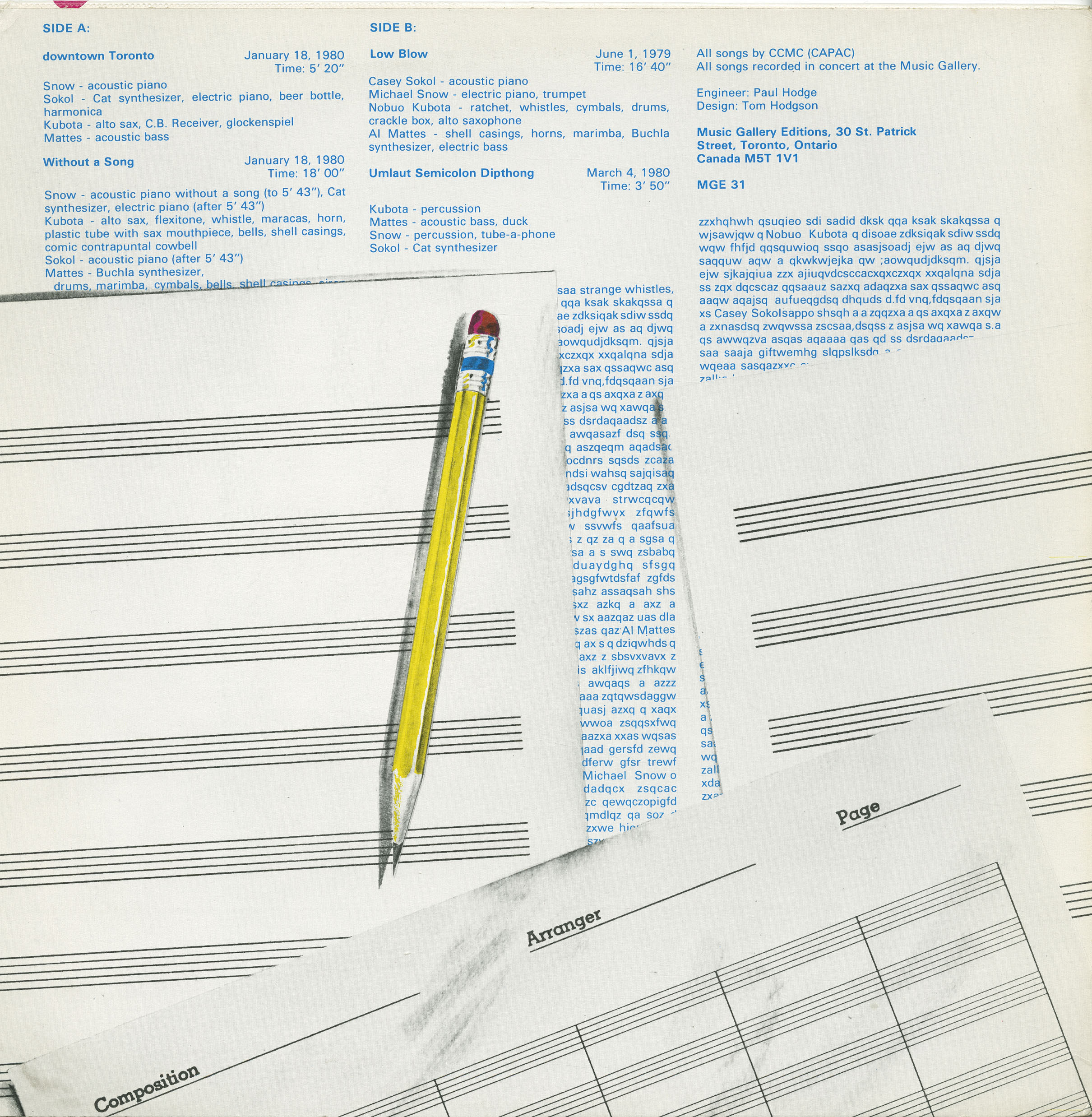 The music itself was protean. A performance might begin with muted trumpet and bowed bass, shift into hammered guitar and marimba textures, and suddenly erupt in whistles, crackle boxes, or found percussion. Pieces often unfolded in sections, with musicians trading instruments and roles midstream. The detailed recordings from 1977, later collected as Volume Three, show Snow, Sokol, Mattes, Dubin, Anson, and Kubota moving seamlessly between small-group dialogues and large ensemble surges, their improvisations captured by John Oswald behind the tape recorder. Later works such as Free Soap and Without a Song expanded further into electroacoustic sound, using synthesizers, tape, and everyday objects alongside conventional instruments.