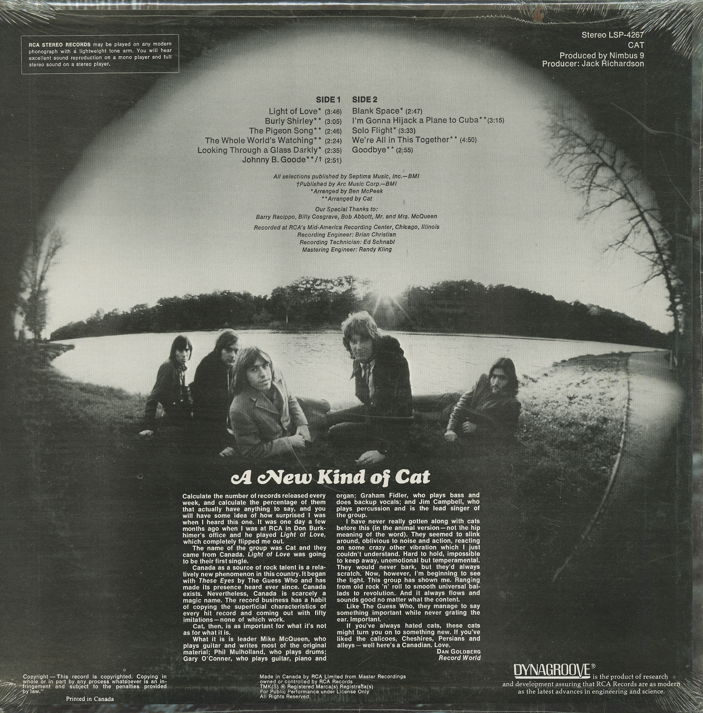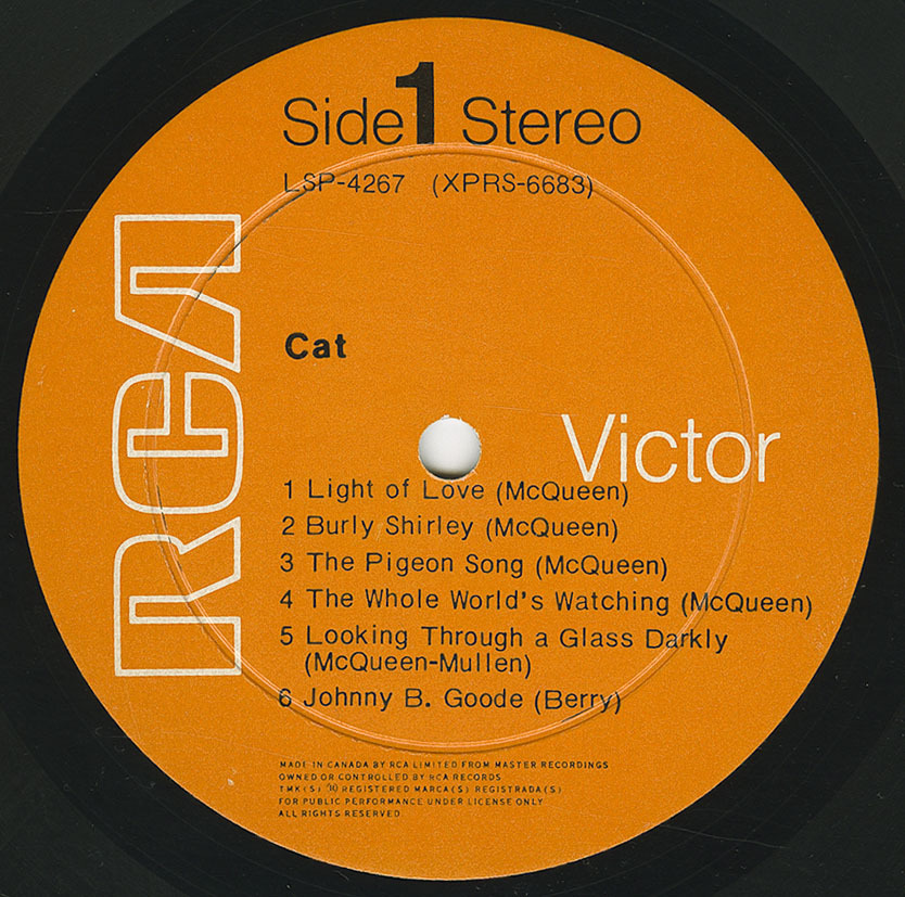 Cat’s only album, Cat (1970), was recorded in Chicago and produced by Jack Richardson, best known for his work with The Guess Who. As on the Spasstiks single, McQueen remained the principal songwriter on Cat: he wrote almost every original track, except for “Looking Through a Glass Darkly,” co-written with former Spasstiks rhythm guitarist Rob Mullen, and the Chuck Berry cover “Johnny B. Goode.” The album includes the Nimbus single “Light of Love” and “We’re All in This Together,” one of the band’s better-known songs in Canada.