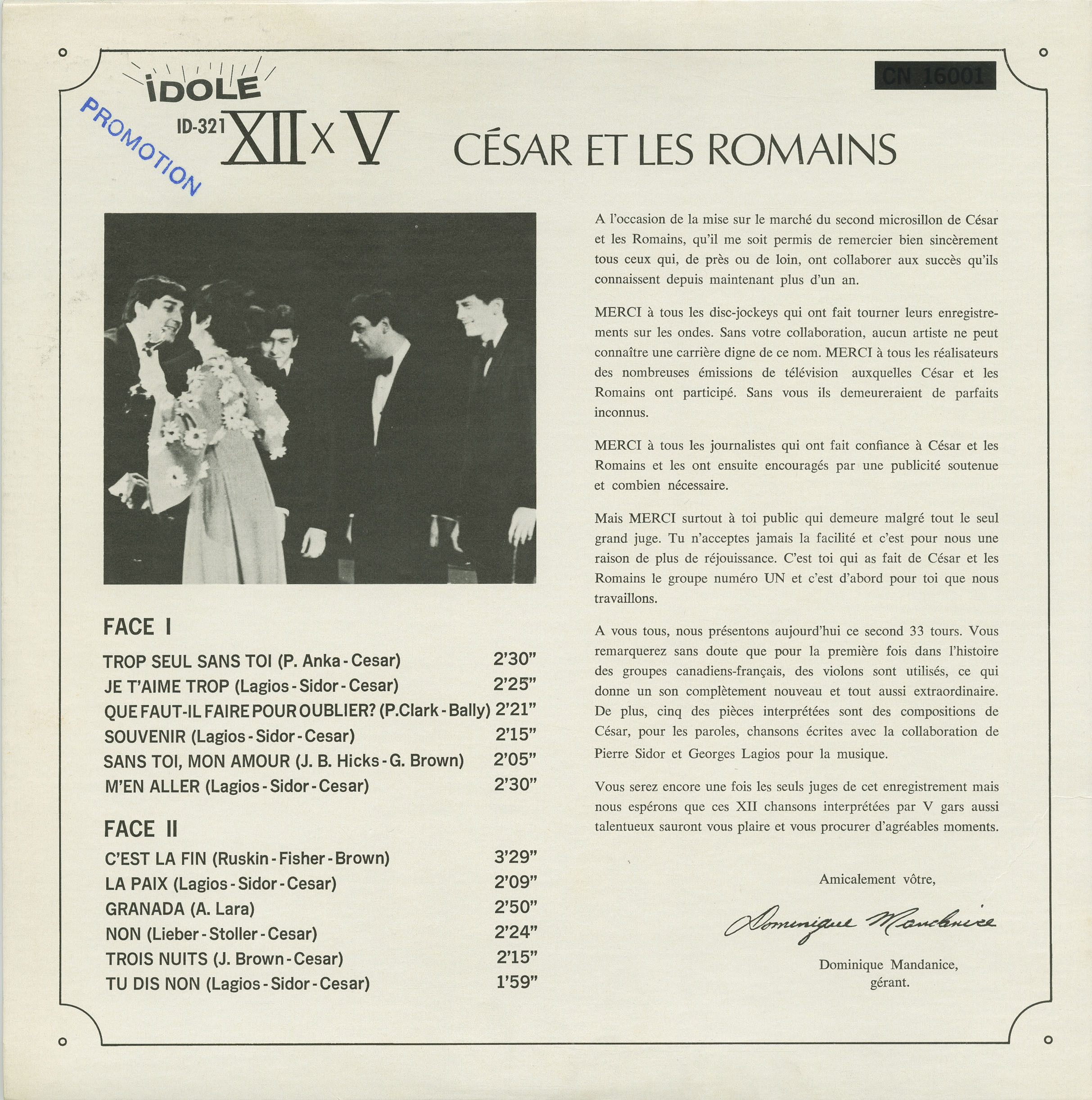 On the occasion of the release of César et les Romains' second LP, allow me to sincerely thank all those who, directly or indirectly, have contributed to the success they have enjoyed for more than a year now.