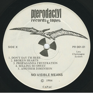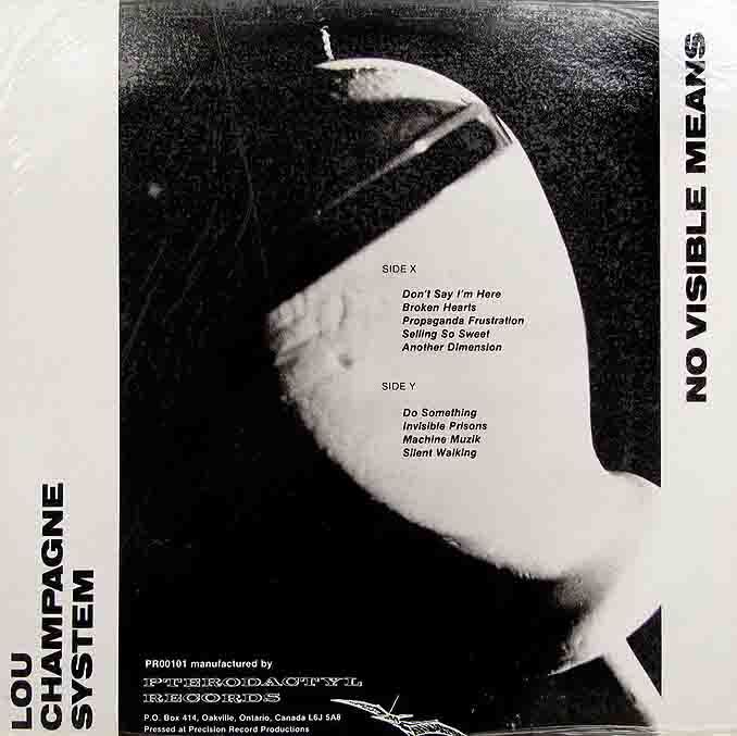 Canadian post-punk classic by one-man synth, guitar and syn-drum band, Lou Champagne System. 'No Visible Means' was privately pressed on Lou's Ontario-based Pterodactyl Records in 1983. Over nine tracks he serves an impressively diverse array of post-punk styles, from more jagged guitar-driven wave pop to slicker electronic disco with a slightly daft but endearing darkside lyrical rhetoric. It's the latter styles which make up the highlights, including one in particular 'Propoganda Frustration', a standout piece of arpeggiated disco bass and tortured vox with a shifty patina of dubbed-out guitar primed for the darkest dancefloors. Equally on a dry, motorik minimal tip, there's the excellent 'Silent Walking', while the rest tends towards spikier punk modes, like the propulsive guitar and rushing machine rhythm vectors of 'Another Dimension' and the snotty fury of 'Do Something'.