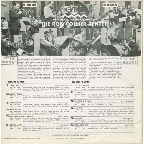 The first jazz composer to receive a Canada Council Grant for advanced study, Ron Collier is one of the young-and-unpretentious new look of television jazz. Ron appeared last year for a Marking Time Special (Toronto’s tribute to the Stratford Music Festival, 1957). These same talents were evident at the Stratford performance of his own music, and this excellent Tentet record. As a musician-composer and arranger (and sometimes actor), Ron Collier has performed for the CBC, CTV, and in film.