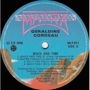 All of those sides fed naturally into her lone full-length album, Space and Time, released in 1984. The LP brought together eight tracks—cosmic, polished, and deeply rooted in the Montréal synth-disco aesthetic—arranged by her longtime collaborator John Brenner and produced by Brenner and C. “Cussy” Nicodemo. Cordeau sang all lead vocals, supported by a tight in-house cast that handled congas, drum overdubs, keyboards, and multiple layers of harmonies. Recorded at Ultrason Studio, with “Sounds in the Night” cut earlier at Mechanicland, the album blended Prophet-5 textures, vocoder shading, and dance-floor momentum into a cohesive atmosphere that made it one of Matra’s standout releases. It even earned a Gala de l’ADISQ nomination for Dance Album of the Year, placing her among Quebec’s top disco and dance artists of the time, and the LP later circulated in Spain under the bilingual title Espacio y Tiempo.