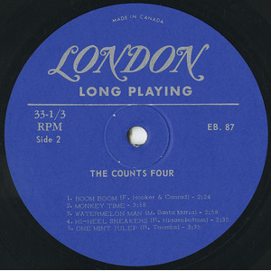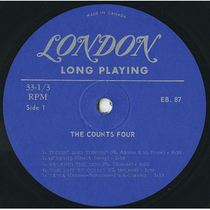 The Counts Four are a triple treat group: they play solos…duets…blues or rock n’ roll. This LP certainly shows that they have created their own special brand of driving music. Theirs has been a short but phenomenal career. From one night stands and school hops to top engagements throughout Canada and the United States all in the space of one year. Here are four young men with a big musical message who are going places…..but fast!