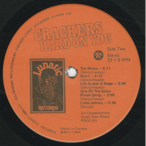 Crackers returned to Grant Avenue for Hard On You in 1980, again with Lanois engineering and co-producing. Released on Denis’ own Lunatic Records label in partnership with World Records (catalog number WRC1-1264), the album refined the group’s delivery without losing their wild edge. Tracks including “Double Trouble,” “Visions,” and the talk-box opener “Crackers in Concert” became staples across the Canadian university and festival circuit.