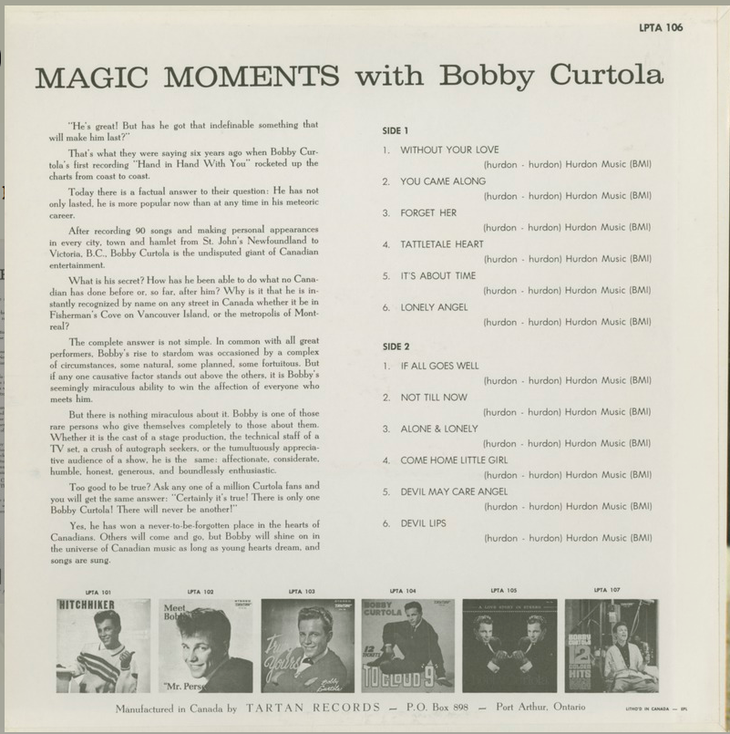 Curtola’s chart run was remarkable: 25 gold singles and 12 gold albums through the 1960s, capped by the 1966 RPM Award for Best Male Vocalist. He also pioneered the model of the Canadian touring pop star, crisscrossing the country at a time when most acts still looked abroad to make their careers.