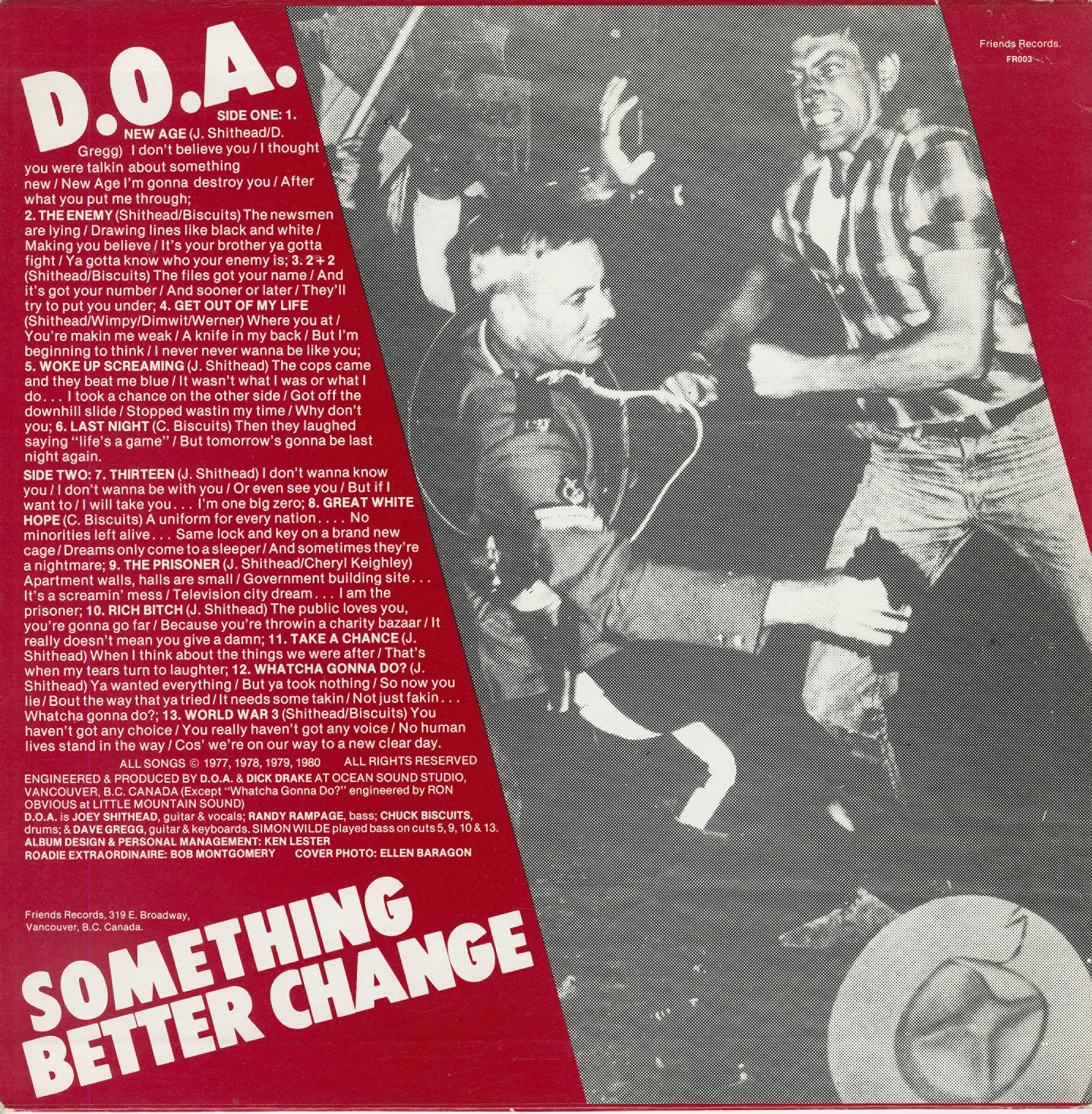 About time! For nearly two decades since they went out of print, the first two classic punk DOA LPs were bowdlerized into Bloodied But Unbowed, and then, to address the numerous songs regrettably removed in the process, the Polish import (!) non-LP Greatest Shits appeared. Yet, when one considers how revolutionary and yet how distinct from each other those two LPs were, this state of affairs just made no sense. In an era when so few North American punk greats ever made an actual LP, how could two such crucial ones remain so unavailable for so long? Thankfully, here's the first of them, in its natural, restored state, just as it appeared in 1980 -- and how glorious it remains! The product of two years of solid gigging in their native Vancouver, by the hottest punk rock band the West Coast ever produced this side of the much different Weirdos and Avengers, Something Better Change features a trio so molten, they didn't even manage to get it all down in the studio. And yet it still is an absolutely awesome record. So heavy with chops it nearly leaks, soaring like the best Clash/Pistols/S.L.F. riffs filtered through an American anvil power even those greats couldn't approach. On the faster cuts, DOA just turn the aggression up several notches. And on the slower cuts they prove themselves as much a strong, fiery, spit-a-flyin' rock & roll band as they are a punk one. Sadly, there is only one bonus track, the also great re-recording of their first EP "Disco Sucks" as "New Wave Sucks." But for those who thought that the English had the market cornered on late-'70s punk, DOA could flat-out outplay them all, and this LP is a bomb with sociopolitical smarts and irreverent attitude.