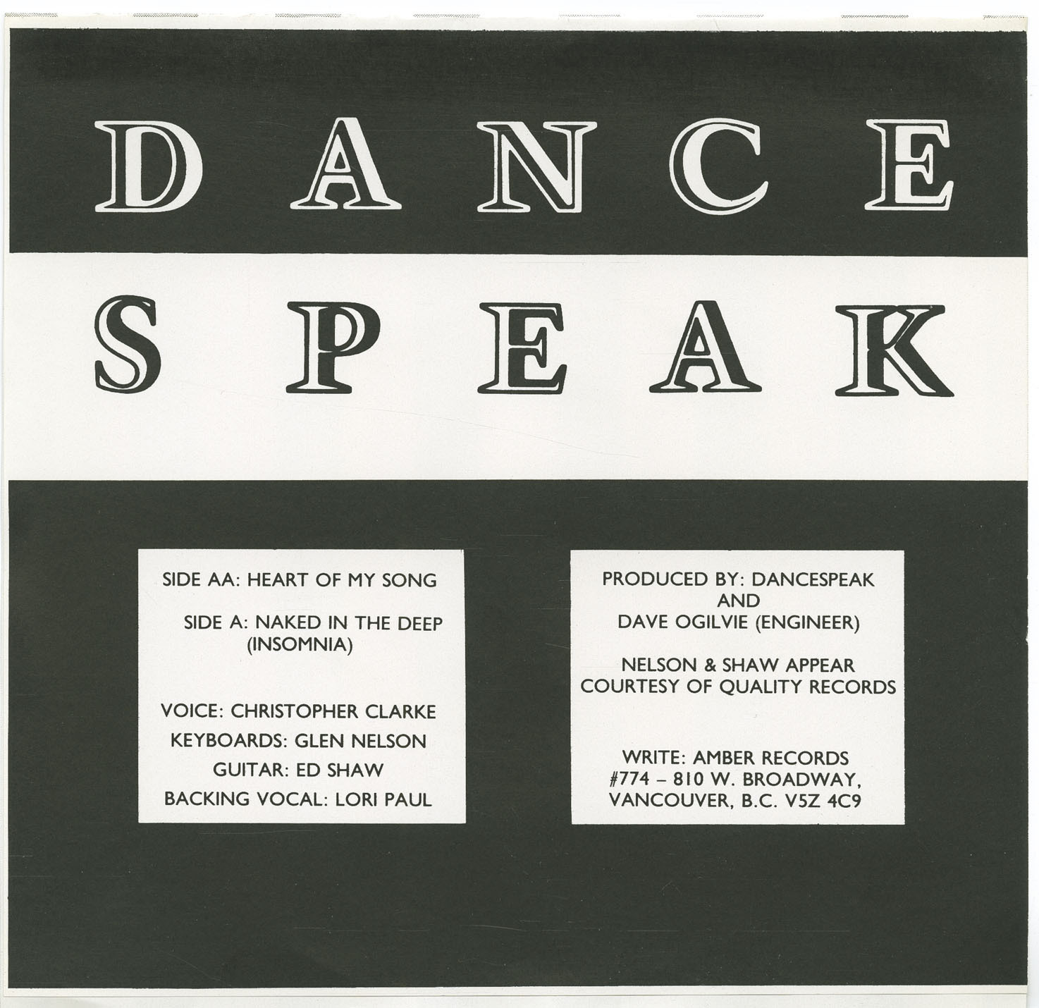 The project’s earliest releases, including the Amber Records single ‘Heart of My Song’ b/w ‘Naked in the Deep (Insomnia)’ and the 1989 Intrepid Records 12-inch The Necessary Illusion, place Dancespeak within Vancouver’s industrial-adjacent orbit. Production on key tracks by Dave “Rave” Ogilvie—closely associated with the city’s industrial sound—reinforced those connections, while backing vocals from the Atalanta Sisters and distribution through BMG Music Canada reflected a project operating between independent experimentation and wider commercial infrastructure.