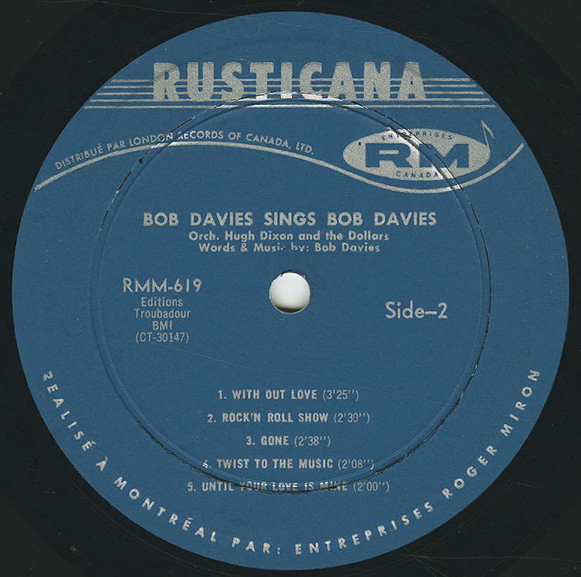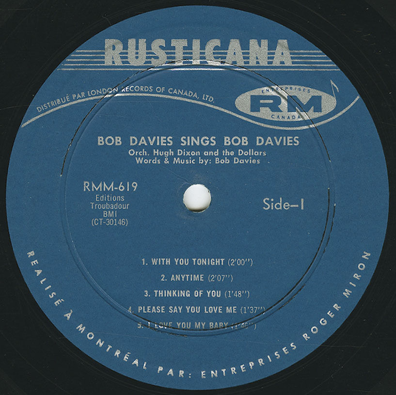 Through Dixon, Davies met Roger Miron, who ran Rusticana and Click Records. His Bob Davies sings Bob Davies LP appeared on Rusticana in 1963. For this release, Danny Smith's brother Billy took over on drums and Davies's old band mate Rick Munro joined The Dollars on bass, replacing Robertson. In spite of the late recording date, the songs on this album are surprisingly good rockers. Cashbox reviewed "Rock'n Roll Show" and "With You Tonight" (album tracks issued as a single on Click), giving both cuts the nod with a B+ (their highest grade). London Records expressed some interest in releasing this record in the States, but, unfortunately, Miron apparently never pursued it. It was, however, released on that label in the United Kingdom. Other tunes off the album also made Montreal radio station CKGM's Super Six charts. During this time, Davies continued to play clubs around Québec, including Le Baril d'Huitres, Le Bal Tabarin and Chez êmile in Québec City, as well as Ottawa and Toronto, also doing the occasional TV show. In 1964, Davies re-formed The Bobsmiths. He and Danny Smith had performed briefly under that name for about a year, in 1961 and 1962. The reunited duo toured a lot, doing Beatles take-offs and hockey and boxing skits, as well as playing Davies' compositions and hits of the day. They were extremely popular in clubs, so Davies assembled an album with songs culled from his Bob Davies sings Bob Davies LP and some new material he had written. This "new" album was also issued on Rusticana and titled, with a tip of the hat to the mop tops, Meet The Bobsmiths. The new songs were cut with backing provided by The Dollars. Davies and Smith moved to Ontario in the late sixties and carried on with their club work in much the same fashion. They put out an album in 1971 - the same year they split. Recorded live at The Derby (a club in Toronto) it is an accurate reflection of what their shows were like then. After that, Davies continued performing on his own. In 1977, he took a year off to recuperate from the toll taken by his many years on the club circuit. These days he is still entertaining, occasionally playing at charity events and sometimes in lounges, on the weekend.