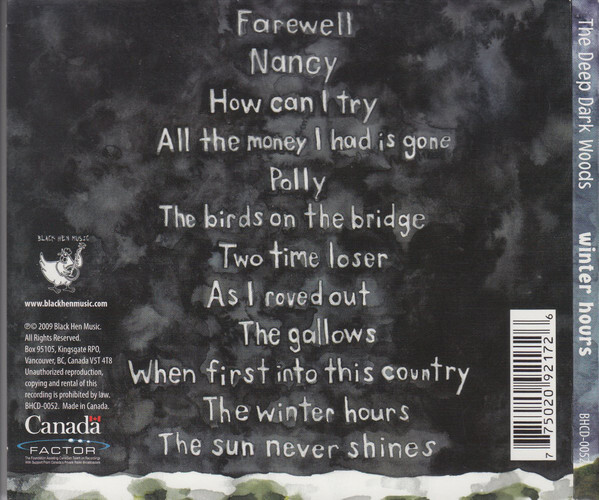 "Winter Hours", The Deep Dark Woods' sophomore release on Black Hen Music, is an album full of raw emotion, sadness, beautiful vocals and harmonies, new sounds, and well thought out arrangements. Working with Juno award winning producer/musician Steve Dawson at Vancouver's famed recording studio "The Factory", they managed to bring out an energy that the new songs deserved, recording the album live off the floor. What was created represents a collection of their best songs yet, the ever changing sound of the band, and a step forward from their touted first release "Hang Me, oh Hang Me", which was nominated for Best Roots Album at the Western Canadian Music Awards this year.