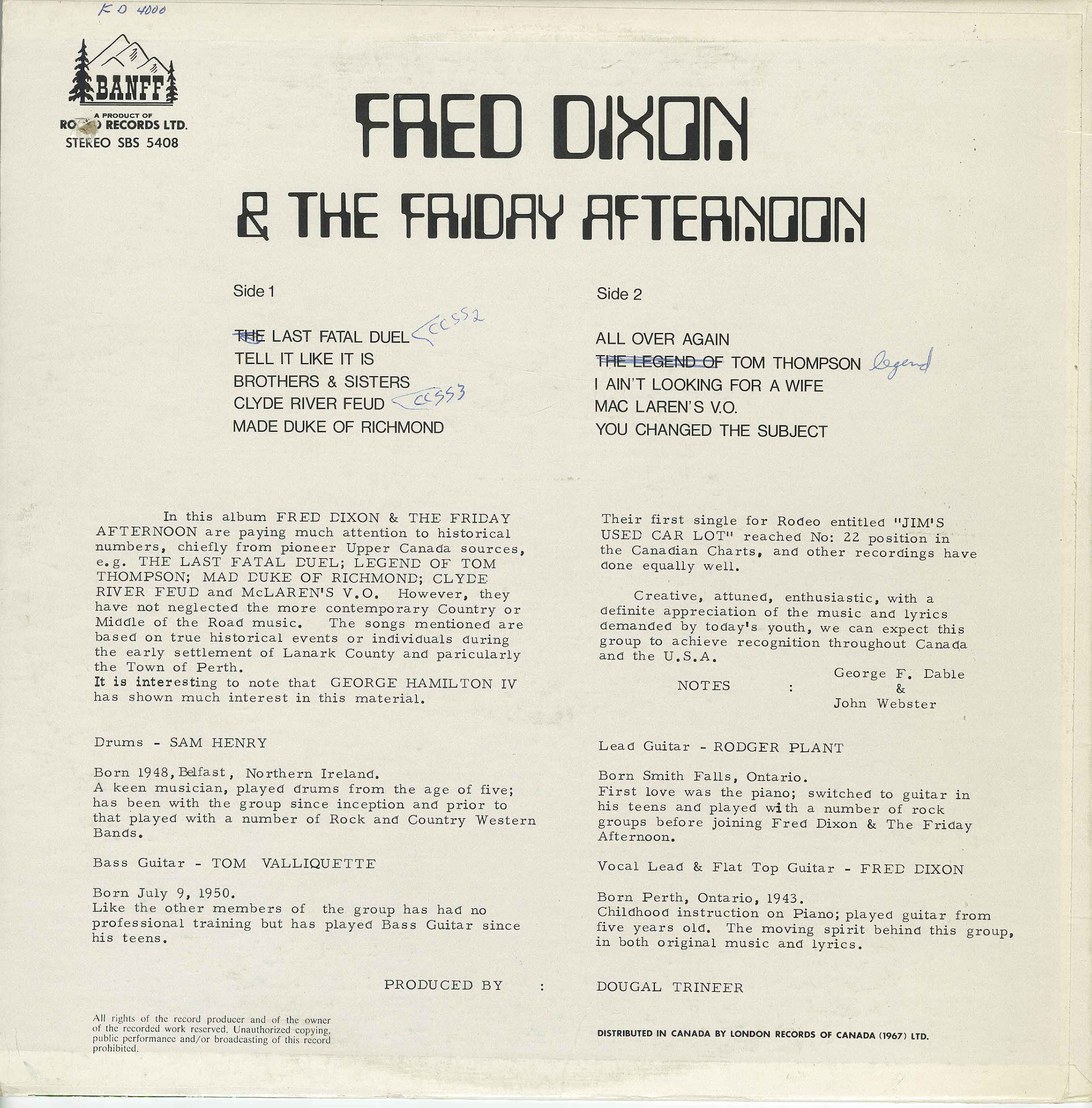 Fred Dixon was born in 1943 in Perth, Ontario. He first came onto the music scene in the late 60s with two obscure 45s by The Friday Afternoon for Trend Records (the label best known for releasing the BENT WIND LP). This record, issued on the predominantly Country record label, was recorded a year later and features Excellent Hippie-Folkrock. Plenty of historical Canadian numbers here, chiefly from pioneer Upper Canada sources.
