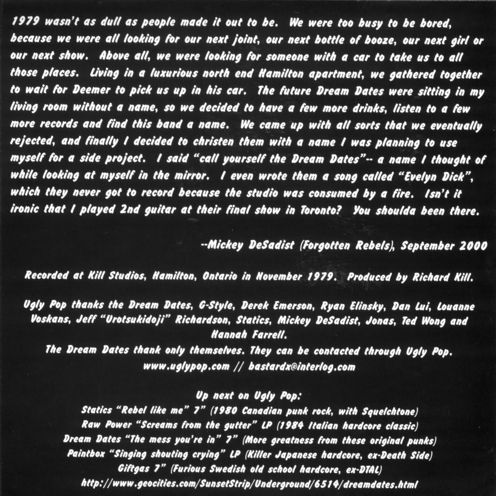 Though their recorded output was minimal, The Dream Dates remain remembered for their uncompromising live presence and for capturing, if only briefly, the raw spirit of Hamilton and Toronto punk at the moment it was still dangerous, unpolished, and very much alive.
